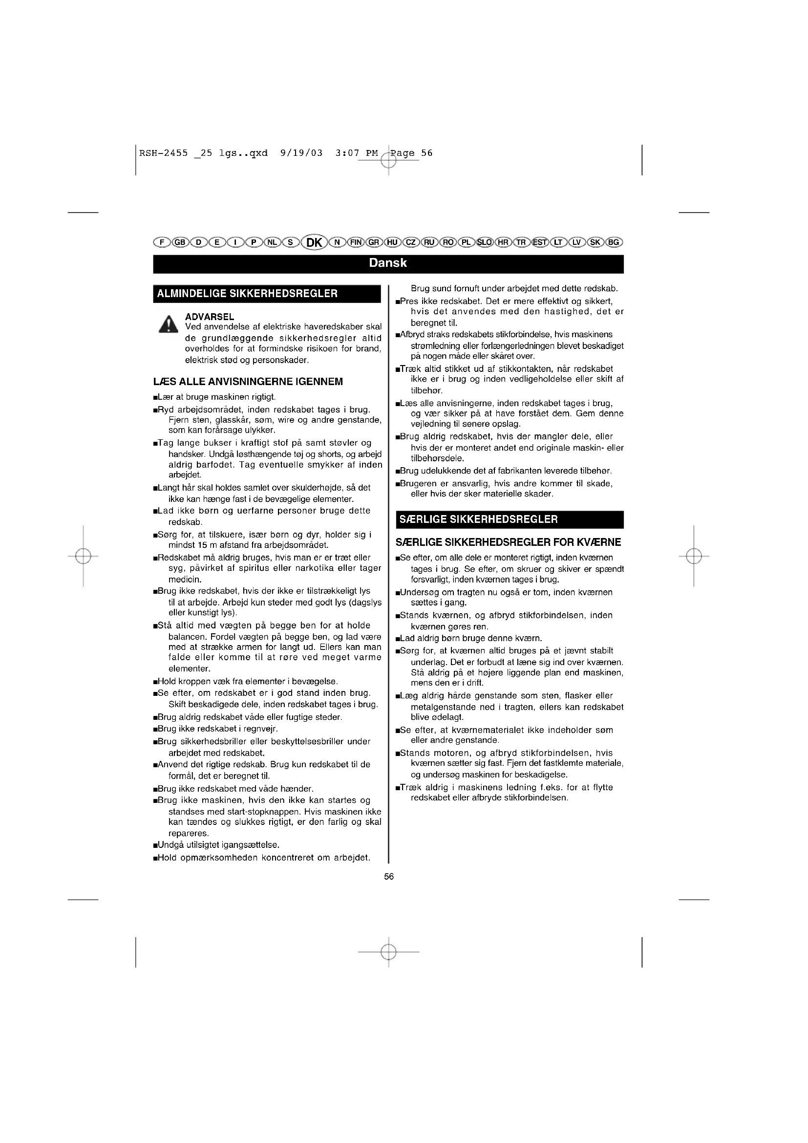 Ved anwendelse af elektriske haveredskaber skal de grundlaaggende sikkerhedsregler altid overholds for at formindske risikoen for brand, elektrisk sted og personskader.