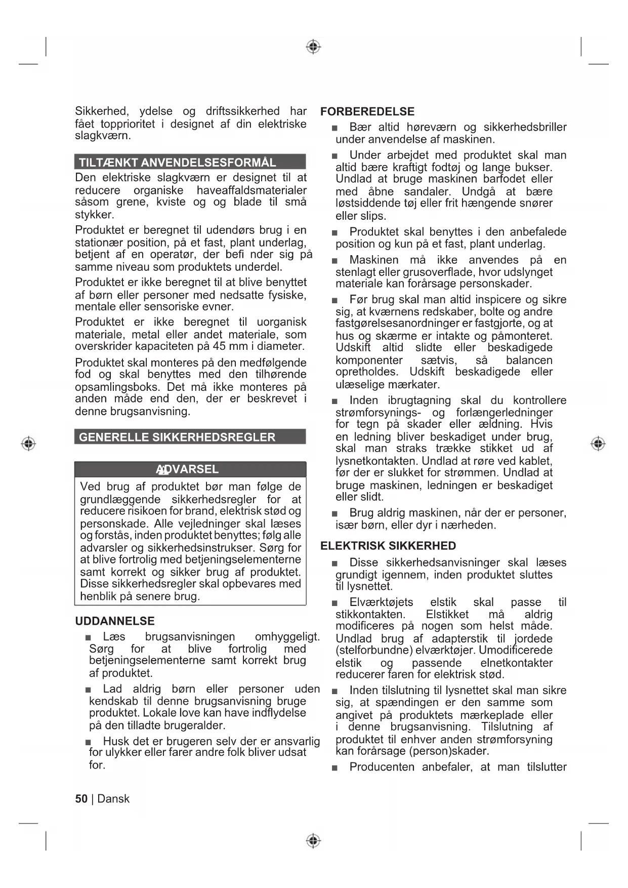 Den elektriske slagkværn er designet til at reducere organiske haveaffaldsmaterialer såsom grene, kviste og og blade til små stykker. Produktet er beregnet til udendørs brug i en stationær position, på et fast, plant underlag, betjent af en operatør, der befi nder sig på samme niveau som produktets underdel. Produktet er ikke beregnet til at blive benyttet af børn eller personer med nedsatte fysiske, mentale eller sensoriske evner. Produktet er ikke beregnet til uorganisk materiale, metal eller andet materiale, som overskrider kapaciteten på 45 mm i diameter. Produktet skal monteres på den medfølgende fod og skal benyttes med den tilhørende opsamlingsboks. Det må ikke monteres på anden måde end den, der er beskrevet i denne brugsanvisning. GENERELLE SIKKERHEDSREGLER ADVARSEL Ved brug af produktet bør man følge de grundlæggende sikkerhedsregler for at reducere risikoen for brand, elektrisk stød og personskade. Alle vejledninger skal læses og forstås, inden produktet benyttes; følg alle advarsler og sikkerhedsinstrukser. Sørg for at blive fortrolig med betjeningselementerne samt korrekt og sikker brug af produktet. Disse sikkerhedsregler skal opbevares med henblik på senere brug. UDDANNELSE ■ Læs brugsanvisningen omhyggeligt. Sørg for at blive fortrolig med betjeningselementerne samt korrekt brug af produktet. ■ Lad aldrig børn eller personer uden kendskab til denne brugsanvisning bruge produktet. Lokale love kan have indflydelse på den tilladte brugeralder. ■ Husk det er brugeren selv der er ansvarlig for ulykker eller farer andre folk bliver udsat for. FORBEREDELSE ■ Bær altid høreværn og sikkerhedsbriller under anvendelse af maskinen. ■ Under arbejdet med produktet skal man altid bære kraftigt fodtøj og lange bukser. Undlad at bruge maskinen barfodet eller med åbne sandaler. Undgå at bære løstsiddende tøj eller frit hængende snører eller slips. ■ Produktet skal benyttes i den anbefalede position og kun på et fast, plant underlag. ■ Maskinen må ikke anvendes på en stenlagt eller grusoverflade, hvor udslynget materiale kan forårsage personskader. ■ Før brug skal man altid inspicere og sikre sig, at kværnens redskaber, bolte og andre fastgørelsesanordninger er fastgjorte, og at hus og skærme er intakte og påmonteret. Udskift altid slidte eller beskadigede komponenter sætvis, så balancen opretholdes. Udskift beskadigede eller ulæselige mærkater. ■ Inden ibrugtagning skal du kontrollere strømforsynings- og forlængerledninger for tegn på skader eller ældning. Hvis en ledning bliver beskadiget under brug, skal man straks trække stikket ud af lysnetkontakten. Undlad at røre ved kablet, før der er slukket for strømmen. Undlad at bruge maskinen, ledningen er beskadiget eller slidt. ■ Brug aldrig maskinen, når der er personer, især børn, eller dyr i nærheden. ELEKTRISK SIKKERHED ■ Disse sikkerhedsanvisninger skal læses grundigt igennem, inden produktet sluttes til lysnettet. ■ Elværktøjets elstik skal passe til stikkontakten. Elstikket må aldrig modificeres på nogen som helst måde. Undlad brug af adapterstik til jordede (stelforbundne) elværktøjer. Umodificerede elstik og passende elnetkontakter reducerer faren for elektrisk stød. ■ Inden tilslutning til lysnettet skal man sikre sig, at spændingen er den samme som angivet på produktets mærkeplade eller i denne brugsanvisning. Tilslutning af produktet til enhver anden strømforsyning kan forårsage (person)skader. ■ Producenten anbefaler, at man tilslutter51 Dansk |