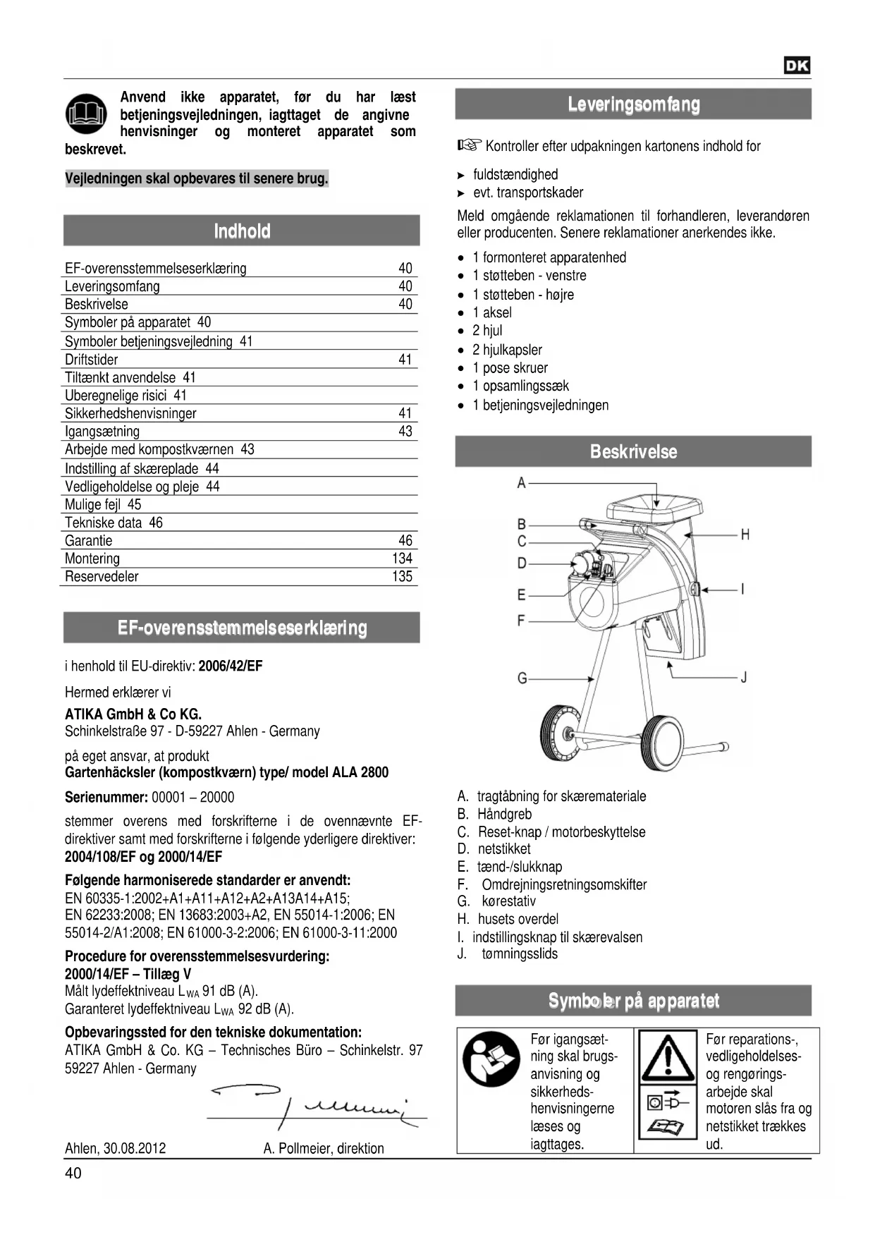 EF-overensstemmelseserklæring 40 Leveringsomfang 40 Beskrivelse 40 Symboler på apparatet 40 Symboler betjeningsvejledning 41 Driftstider 41 Tiltænkt anvendelse 41 Uberegnelige risici 41 Sikkerhedshenvisninger 41 Igangsætning 43 Arbejde med kompostkværnen 43 Indstilling af skæreplade 44 Vedligeholdelse og pleje 44 Mulige fejl 45 Tekniske data 46 Garantie 46 Montering 134 Reservedeler 135