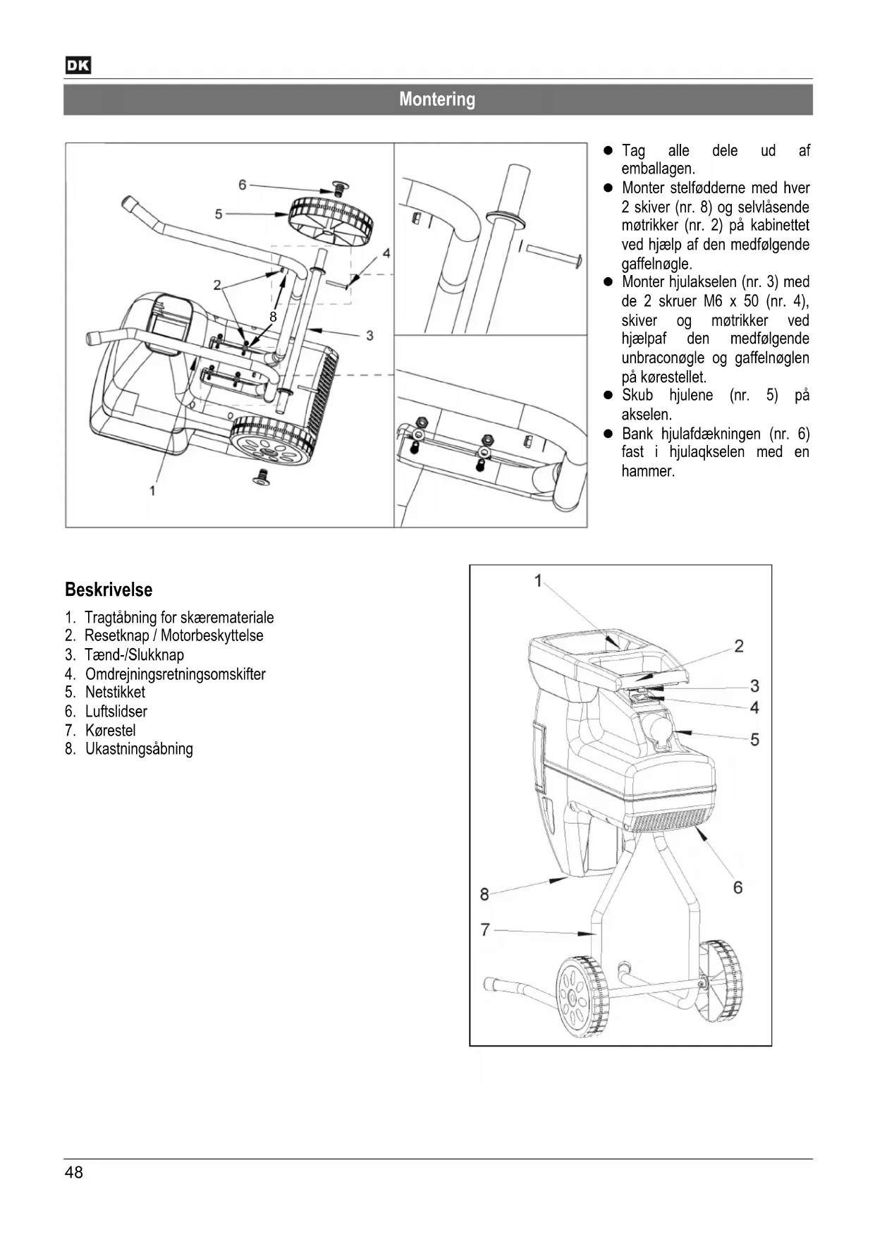 Technické změny vyhrazeny!48 Montering Tag alle dele ud af emballagen. Monter stelfødderne med hver 2 skiver (nr. 8) og selvlåsende møtrikker (nr. 2) på kabinettet ved hjælp af den medfølgende gaffelnøgle. Monter hjulakselen (nr. 3) med de 2 skruer M6 x 50 (nr. 4), skiver og møtrikker ved hjælpaf den medfølgende unbraconøgle og gaffelnøglen på kørestellet. Skub hjulene (nr. 5) på akselen. Bank hjulafdækningen (nr. 6) fast i hjulaqkselen med en hammer.