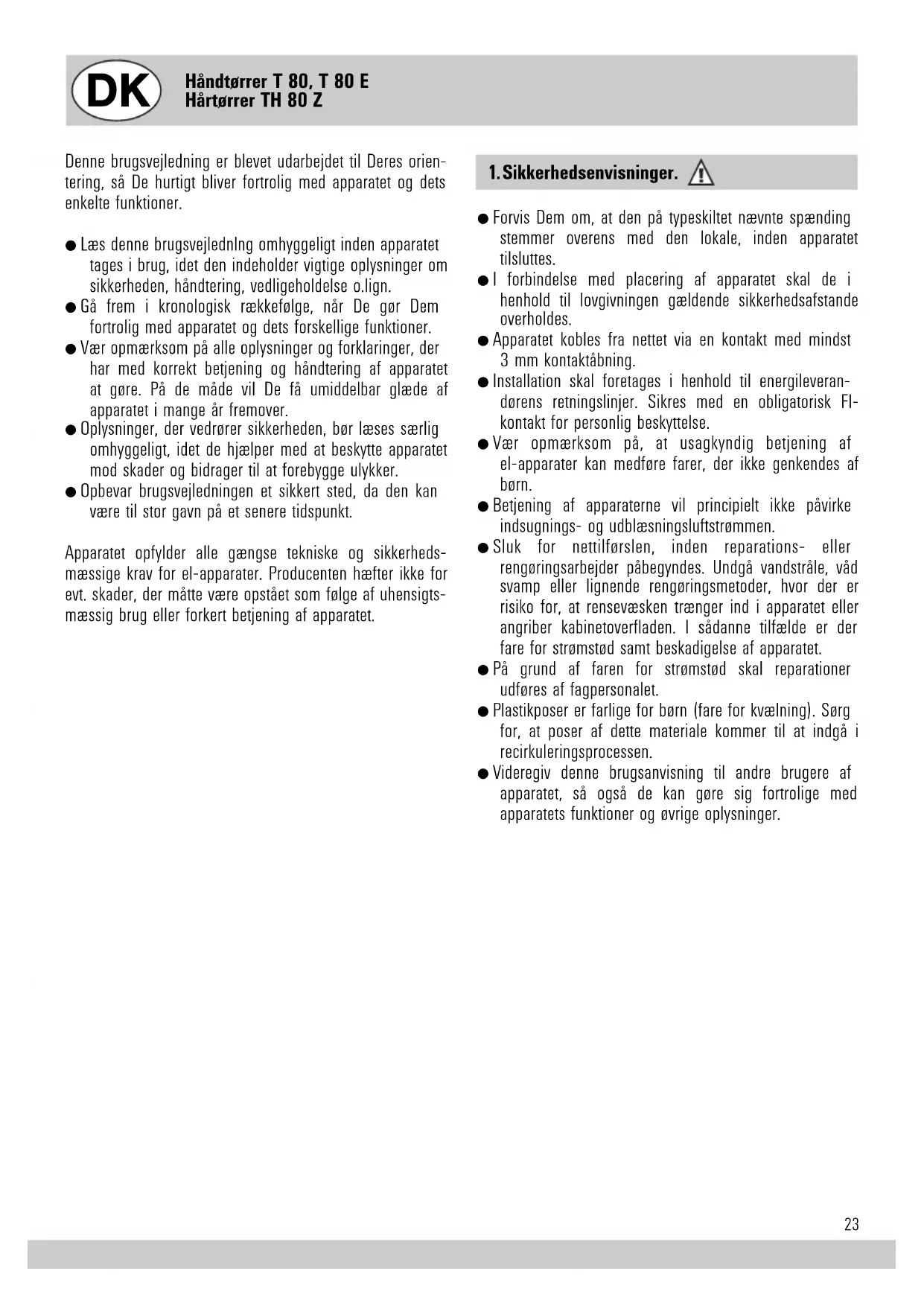 Få en fagmand til at montere varmlufttørreren, idet apparatet skal tilsluttes under hensyntagen til de gængse sikkerhedsbestemmelser. I forbindelse med model T 80 og TH 80 Z skal el-installationen forsynes med en LS-kontakt eller en sikring. På installationssiden skal der tages højde for en topolet netadskiller med en kontaktafstand på mindst 3 mm på hver pol.