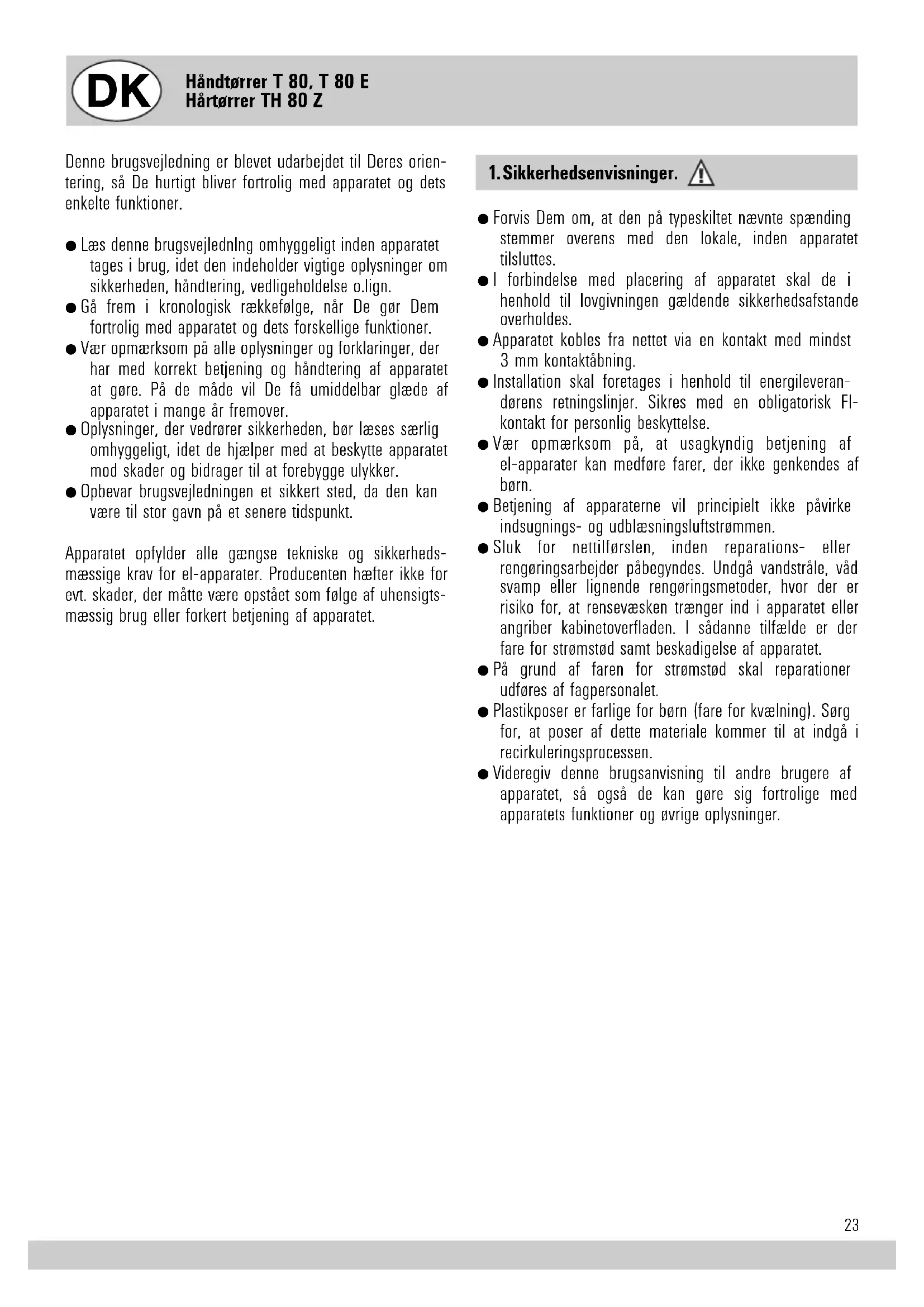 Få en fagmand til at montere varmlufttørreren, idet apparatet skal tilsluttes under hensyntagen til de gængse sikkerhedsbestemmelse. I forbindelse med model T 80 og TH 80 Z skal el-installationen forsynes med en LS-kontakt eller en sikring. På installationssiden skal der tages højde for entopolet netadskiller med en kontaktafstand på mindst 3 mm på hvør pol.