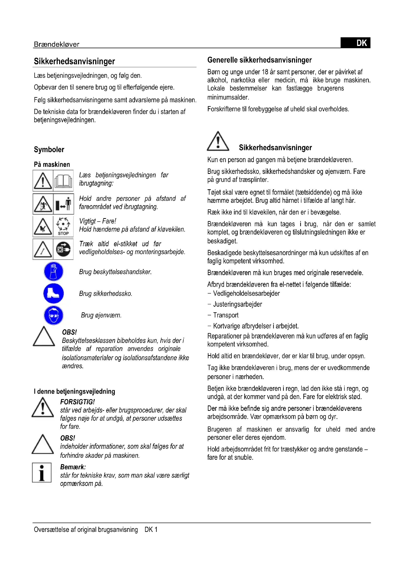 Sikkerhedsanvisninger Læs betjeningsvejledningen, og følg den. Opbevar den til senere brug og til efterfølgende ejere. Følg sikkerhedsanvisningerne samt advarslerne på maskinen. De tekniske data for brændekløveren finder du i starten af betjeningsvejledningen. Symboler På maskinen Læs betjeningsvejledningen før ibrugtagning: Hold andre personer på afstand af fareområdet ved ibrugtagning. Vigtigt – Fare! Hold hænderne på afstand af kløvekilen. Træk altid el-stikket ud før vedligeholdelses- og monteringsarbejde. Brug beskyttelseshandsker. Brug sikkerhedssko. Brug øjenværn. OBS! Beskyttelsesklassen bibeholdes kun, hvis der i tilfælde af reparation anvendes originale isolationsmaterialer og isolationsafstandene ikke ændres. I denne betjeningsvejledning FORSIGTIG! står ved arbejds- eller brugsprocedurer, der skal følges nøje for at undgå, at personer udsættes for fare. OBS! indeholder informationer, som skal følges for at forhindre skader på maskinen. Bemærk: står for tekniske krav, som man skal være særligt opmærksom på. Generelle sikkerhedsanvisninger Børn og unge under 18 år samt personer, der er påvirket af alkohol, narkotika eller medicin, må ikke bruge maskinen. Lokale bestemmelser kan fastlægge brugerens minimumsalder. Forskrifterne til forebyggelse af uheld skal overholdes. Sikkerhedsanvisninger Kun en person ad gangen må betjene brændekløveren. Brug sikkerhedssko, sikkerhedshandsker og øjenværn. Fare på grund af træsplinter. Tøjet skal være egnet til formålet (tætsiddende) og må ikke hæmme arbejdet. Brug altid hårnet i tilfælde af langt hår. Ræk ikke ind til kløvekilen, når den er i bevægelse. Brændekløveren må kun tages i brug, når den er samlet komplet, og brændekløveren og tilslutningsledningen ikke er beskadiget. Beskadigede beskyttelsesanordninger må kun udskiftes af en faglig kompetent virksomhed. Brændekløveren må kun bruges med originale reservedele. Afbryd brændekløveren fra el-nettet i følgende tilfælde: − Vedligeholdelsesarbejder − Justeringsarbejder − Transport − Kortvarige afbrydelser i arbejdet. Reparationer på brændekløveren må kun udføres af en faglig kompetent virksomhed. Hold altid en brændekløver, der er klar til brug, under opsyn. Tag ikke brændekløveren i brug, mens der er uvedkommende personer i nærheden. Betjen ikke brændekløveren i regn, lad den ikke stå i regn, og undgå, at der kommer vand på den. Fare for elektrisk stød. Der må ikke befinde sig andre personer i brændekløverens arbejdsområde. Vær opmærksom på børn og dyr. Brugeren af maskinen er ansvarlig for uheld med andre personer eller deres ejendom. Hold arbejdsområdet frit for træstykker og andre genstande – fare for at snuble. Oversættelse af original brugsanvisning DK 1DK Brændekløver Sikkerhedsanordninger Motorværn Ved overbelastning af brændekløveren slår motorværnet motoren fra. Motorværnets funktion må ikke sættes ud af kraft. Hvis motorværnet har slået brændekløveren fra, skal du gøre følgende: