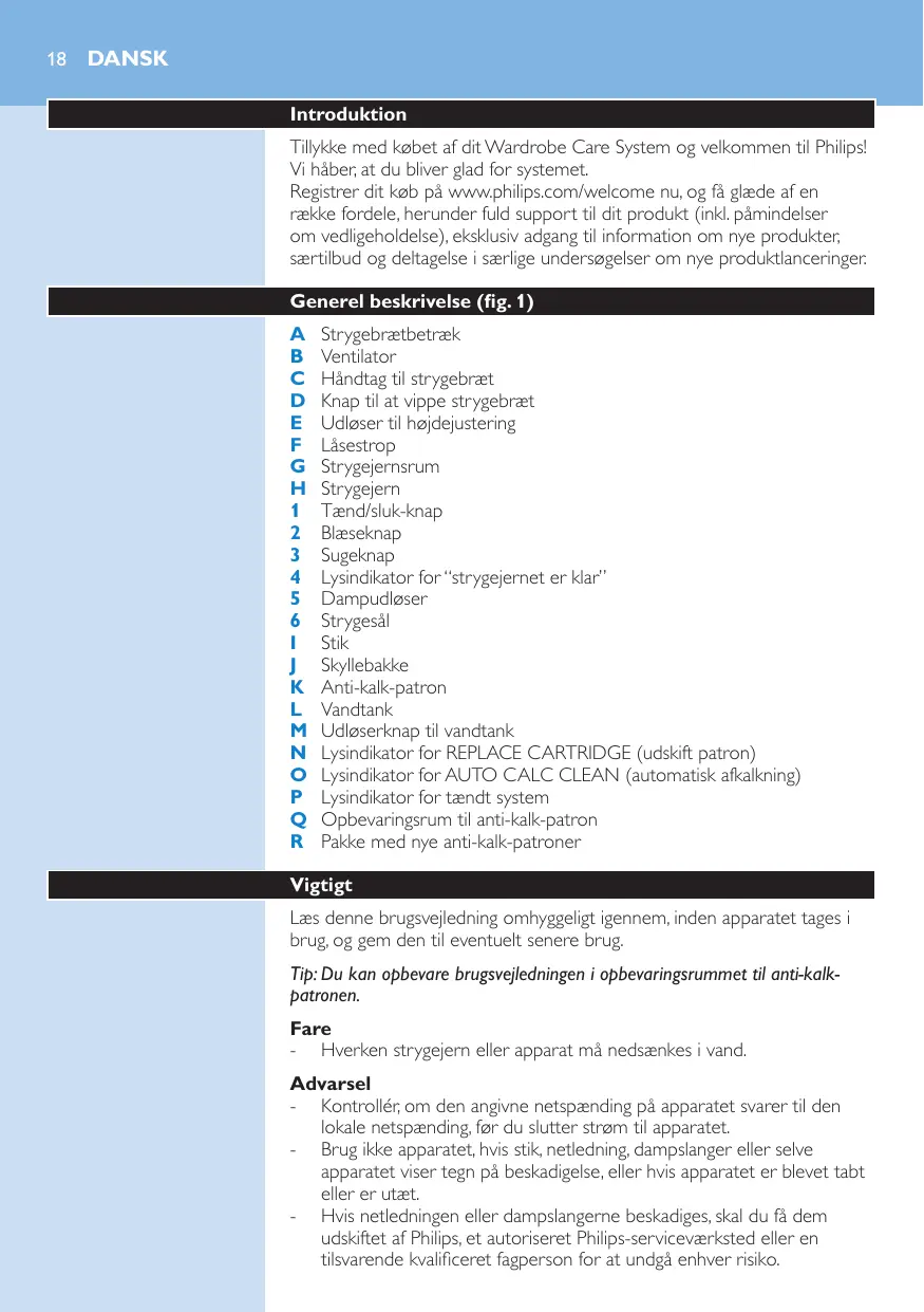 Vigtigt Læs denne brugsvejledning omhyggeligt igennem, inden apparatet tages i brug, og gem den til eventuelt senere brug. Tip: Du kan opbevare brugsvejledningen i opbevaringsrummet til anti-kalkpatronen. Fare -- Hverken strygejern eller apparat må nedsænkes i vand. Advarsel -- Kontrollér, om den angivne netspænding på apparatet svarer til den lokale netspænding, før du slutter strøm til apparatet. -- Brug ikke apparatet, hvis stik, netledning, dampslanger eller selve apparatet viser tegn på beskadigelse, eller hvis apparatet er blevet tabt eller er utæt. -- Hvis netledningen eller dampslangerne beskadiges, skal du få dem udskiftet af Philips, et autoriseret Philips-serviceværksted eller en tilsvarende kvalificeret fagperson for at undgå enhver risiko.