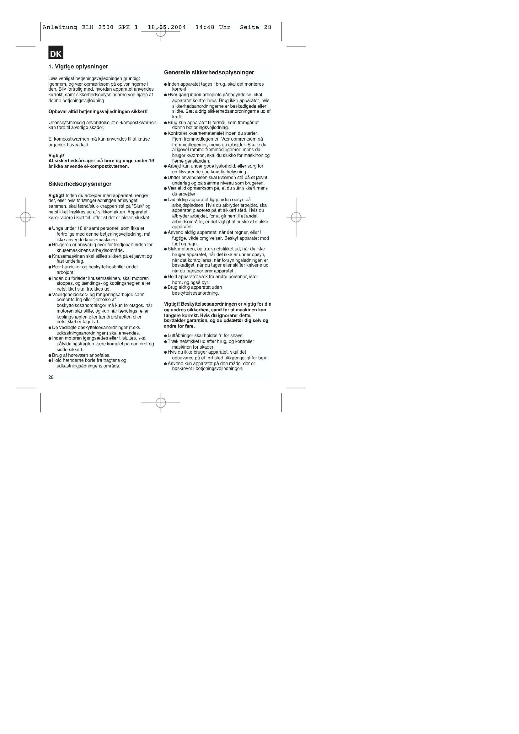- Unge under 16 år samt personer, som ikke er fortrolige med denne betjeningsvejledning, må ikke anvende knusemaskinen.