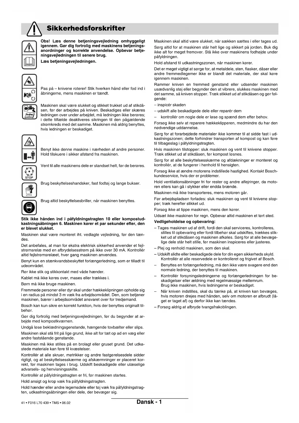 Klantenservice Conformiteitsverklaring F016 L70 439 - book.book Seite 5 Dienstag, 28. Februar 2006 7:57 07 40 • F016 L70 439 • TMS • 06.02Dansk - 1 Obs! Læs denne betjeningsvejledning omhyggeligt igennem. Gør dig fortrolig med maskinens betjenings- anordninger og korrekte anvendelse. Opbevar betje- ningsvejledningen til senere brug. Læs betjeningsvejledningen. Pas på – knivene roterer! Stik hverken hånd eller fod ind i åbningerne, mens maskinen er tændt. Maskinen skal være slukket og stikket trukket ud af stikdå- sen, før der arbejdes på kniven. Beskadiges eller skæres ledningen over under arbejdet, må ledningen ikke berøres; i dette tilfælde deaktiveres sikringen til den pågældende strømkreds med det samme. Maskinen må aldrig benyttes, hvis ledningen er beskadiget. Benyt ikke denne maskine i nærheden af andre personer. Hold tilskuere i sikker afstand fra maskinen. Vent til alle maskinens dele er standset helt, før de berøres. Brug beskyttelseshandsker, fast fodtøj og lange bukser. Brug altid beskyttelsesbriller, når maskinen benyttes. Stik ikke hånden ind i påfyldningstragten 10 eller kompostud- kastningsåbningen 6. Maskinen kører et par sekunder efter, den er blevet slukket. Maskinen skal være monteret iht. vedlagte vejledning, før den tæn- des. Det anbefales, at man for ekstra elektrisk sikkerhed anvender et fejl- strømsrelæ med en afbrydelsesstrøm på ikke over 30 mA. Kontrollér altid fejlstrømsrelæet, hver gang maskinen anvendes. Benyt kun en stænkvandsbeskyttet forlængerledning, som er tilladt til udeområdet. Rør ikke stik og stikkontakt med våde hænder. Kablet må ikke køres over, mases eller trækkes i. Børn må ikke bruge maskinen. Fremmede personer eller dyr skal under hækkeklipningen opholde sig i en radius på mindst 3 m væk fra arbejdsområdet. Den, som betjener maskinen, bærer i arbejdsområdet ansvaret over for tredjemand. Bosch kan kun sikre en korrekt funktion, hvis der benyttes originalt til- behør. Gør dig fortrolig med betjeningsvejledningen, før du begynder at ar- bejde med kompostkværnen. Undgå løse beklædningsgenstande, hængende tovbælter eller slips. Maskinen skal stå frit på lige grund, ikke alt for tæt op ad en væg eller andre faststående genstande. Maskinen må ikke stilles på en brolagt eller gruset grund. Det udka- stede materiale kan føre til kvæstelser. Kontrollér at alle skruer, møtrikker og andre fastgørelsesdele sidder rigtigt, og at beskyttelsesskærme og afskærmninger er placeret kor- rekt, før maskinen tages i brug. Udskift beskadigede eller ulæselige advarsels- og henvisningsskilte. Kontrollér at påfyldningstragten er fri, før maskinen startes. Hold ansigt og krop væk fra påfyldningstragten. Hold hænder eller andre legemsdele eller tøj væk fra påfyldningstrag- ten, udkastningsåbningen eller dele, der bevæger sig. Maskinen skal altid være slukket, når sækken sættes i eller tages ud. Sørg altid for at maskinen står helt lige og sikkert på jorden. Buk dig ikke alt for meget fremover. Stå ikke over maskinens fodhøjde under påfyldningen. Hold afstand til udkastningszonen, når maskinen kører. Det er meget vigtigt at sørge for, at metaldele, sten, flasker, dåser eller andre fremmedlegemer ikke er blandt det materiale, der skal køre igennem maskinen. Rammer kniven en fremmed genstand eller udsender maskinen usædvanlig støj eller begynder den at vibrere, slukkes maskinen med det samme, så kniven stopper. Træk stikket ud af stikdåsen og gør føl- gende: – inspicér skaden – udskift alle beskadigede dele eller reparér dem – kontrollér om nogle dele er løse og spænd dem efter behov. Forsøg ikke selv at reparere hækkeklipperen, medmindre du har den nødvendige uddannelse. Sørg for at forarbejdede materialer ikke kommer til at sidde fast i ud- kastningszonen; dette forhindrer transporten af kompost og kan føre til tilbageslag i påfyldningstragten. Hvis maskinen tilstopper: sluk maskinen og vent til knivene stopper. Træk stikket ud af stikdåsen, før kompost løsnes. Sørg for at alle beskyttelsesskærme og afdækninger er monteret og kontrollér, at de fungerer i henhold til hensigten. Forsøg ikke at ændre motorens indstillede hastighed. Kontakt Bosch- kundeservice, hvis der er problemer. Hold ventilationsåbninger fri for rester og andre aflejringer, da moto- ren ellers kan gå i stykker eller endda brænde. Maskinen må ikke transporteres, mens motoren går. Før arbejdspladsen forlades: sluk maskinen og vent til knivene stop- per; træk herefter stikket ud. Forsøg ikke at tippe maskinen, mens den kører. Udsæt ikke maskinen for regn. Opbevar altid maskinen et tørt sted. Vedligeholdelse og opbevaring: – Tages maskinen ud af drift, fordi den skal serviceres, kontrolleres, stilles til opbevaring eller fordi tilbehør skal udskiftes, trækkes stik- ket ud af stikdåsen og maskinen afkøles. Sørg for at alle bevæge- lige dele står helt stille, før maskinen inspiceres eller justeres. – Plej og renhold maskinen, som den skal. – Udskift slidte eller beskadigede dele for din egen sikkerheds skyld. Kontrollér at alle reservedele er kontrolleret og frigivet af Bosch. – Benyttes en forlængerledning, må den ikke være svagere end den normale ledning, der benyttes til maskinen. – Kontrollér forsyningsledningerne og forlængerledningen for be- skadigelser eller ældning med regelmæssige mellemrum. Brug ikke maskinen, hvis ledningerne er beskadiget. – Når kniven indstilles, skal du tænke på, at kniven kan bevæges, hvis motoren drejes med hånden, selv om motoren er afbrudt (lå- get er taget af) og derfor ikke kan tændes. – Forsøg aldrig at afbryde tvangsfrakoblingen. Sikkerhedsforskrifter STOP F016 L70 439 - book.book Seite 1 Dienstag, 28. Februar 2006 7:57 07 41 • F016 L70 439 • TMS • 06.02Dansk - 2