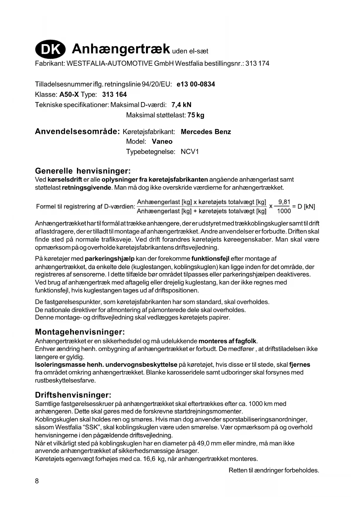 tyč!delší!dobu!používat,!měl!by být!uchycovací!mechanismus kvůli!odlehčení!pružinových elementů!stále!v!uvolněném stavu!(zablokovaná!pozice). K!odlehčení!stlačte!uvolňovací páčku!dopředu. Při&čištění&vozidla&proudem páry&musí&byt&kulová&tyč vyjmuta&a&nasazena&zátka na&rouru. (Kulová&tyč&nesmí&být&nikdy čištěná&proudem&páry)8 Anhængertræk uden el-sæt Fabrikant: WESTFALIA-AUTOMOTIVE GmbH Westfalia bestillingsnr.: 313 174 Tilladelsesnummer iflg. retningslinie 94/20/EU: e13 00-0834 Klasse: A50-X Type: 313 164 Tekniske specifikationer: Maksimal D-værdi: 7,4 kN Maksimal støttelast: 75 kg Anvendelsesområde: Køretøjsfabrikant: Mercedes Benz Model: Vaneo Typebetegnelse: NCV1 Generelle henvisninger: Ved kørselsdrift er alle oplysninger fra køretøjsfabrikanten angående anhængerlast samt støttelast retningsgivende. Man må dog ikke overskride værdierne for anhængertrækket. Anhængertrækket har til formål at trække anhængere, der er udstyret med trækkoblingskugler samt til drift af lastdragere, der er tilladt til montage af anhængertrækket. Andre anvendelser er forbudte. Driften skal finde sted på normale trafiksveje. Ved drift forandres køretøjets køreegenskaber. Man skal være opmærksom på og overholde køretøjsfabrikantens driftsvejledning. På køretøjer med parkeringshjælp kan der forekomme funktionsfejl efter montage af anhængertrækket, da enkelte dele (kuglestangen, koblingskuglen) kan ligge inden for det område, der registreres af sensorerne. I dette tilfælde bør området tilpasses eller parkeringshjælpen deaktiveres. Ved brug af anhængertræk med aftagelig eller drejelig kuglestang, kan der ikke regnes med funktionsfejl, hvis kuglestangen tages ud af driftspositionen. De fastgørelsespunkter, som køretøjsfabrikanten har som standard, skal overholdes. De nationale direktiver for afmontering af påmonterede dele skal overholdes. Denne montage- og driftsvejledning skal vedlægges køretøjets papirer. Montagehenvisninger: Anhængertrækket er en sikkerhedsdel og må udelukkende monteres af fagfolk. Enhver ændring henh. ombygning af anhængertrækket er forbudt. De medfører , at driftstiladelsen ikke længere er gyldig. Isoleringsmasse henh. undervognsbeskyttelse på køretøjet, hvis disse er til stede, skal fjernes fra området omkring anhængertrækket. Blanke karosseridele samt udboringer skal forsynes med rustbeskyttelsesfarve. Driftshenvisninger: Samtlige fastgørelsesskruer på anhængertrækket skal eftertrækkes efter ca. 1000 km med anhængeren. Dette skal gøres med de forskrevne startdrejningsmomenter. Koblingskuglen skal holdes ren og smøres. Hvis man dog anvender sporstabiliseringsanordninger, såsom Westfalia “SSK”, skal koblingskuglen være uden smørelse. Vær opmærksom på og overhold henvisningerne i den pågældende driftsvejledning. Når et vilkårligt sted på koblingskuglen har en diameter på 49,0 mm eller mindre, må man ikke anvende anhængertrækket af sikkerhedsmæssige årsager. Køretøjets egenvægt forhøjes med ca. 16,6 kg, når anhængertrækket monteres. Retten til ændringer forbeholdes. DK9