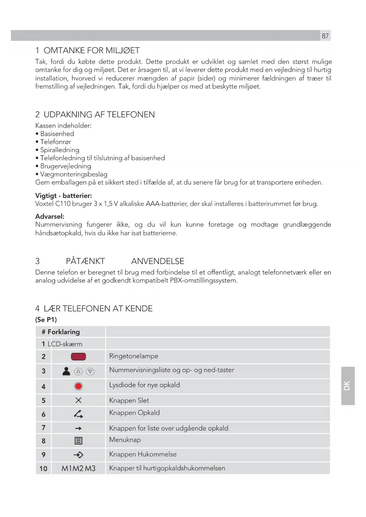 Kassen indeholder: tBasisenhed tTelefonrør tSpiralledning tTelefonledning til tilslutning af basisenhed tBrugervejledning tVægmonteringsbeslag Gem emballagen på et sikkert sted i tilfælde af, at du senere får brug for at transportere enheden. Vigtigt - batterier: Voxtel C110 bruger 3 x 1,5 V alkaliske AAA-batterier, der skal installeres i batterirummet før brug. Advarsel: Nummervisning fungerer ikke, og du vil kun kunne foretage og modtage grundlæggende håndsætopkald, hvis du ikke har isat batterierne.