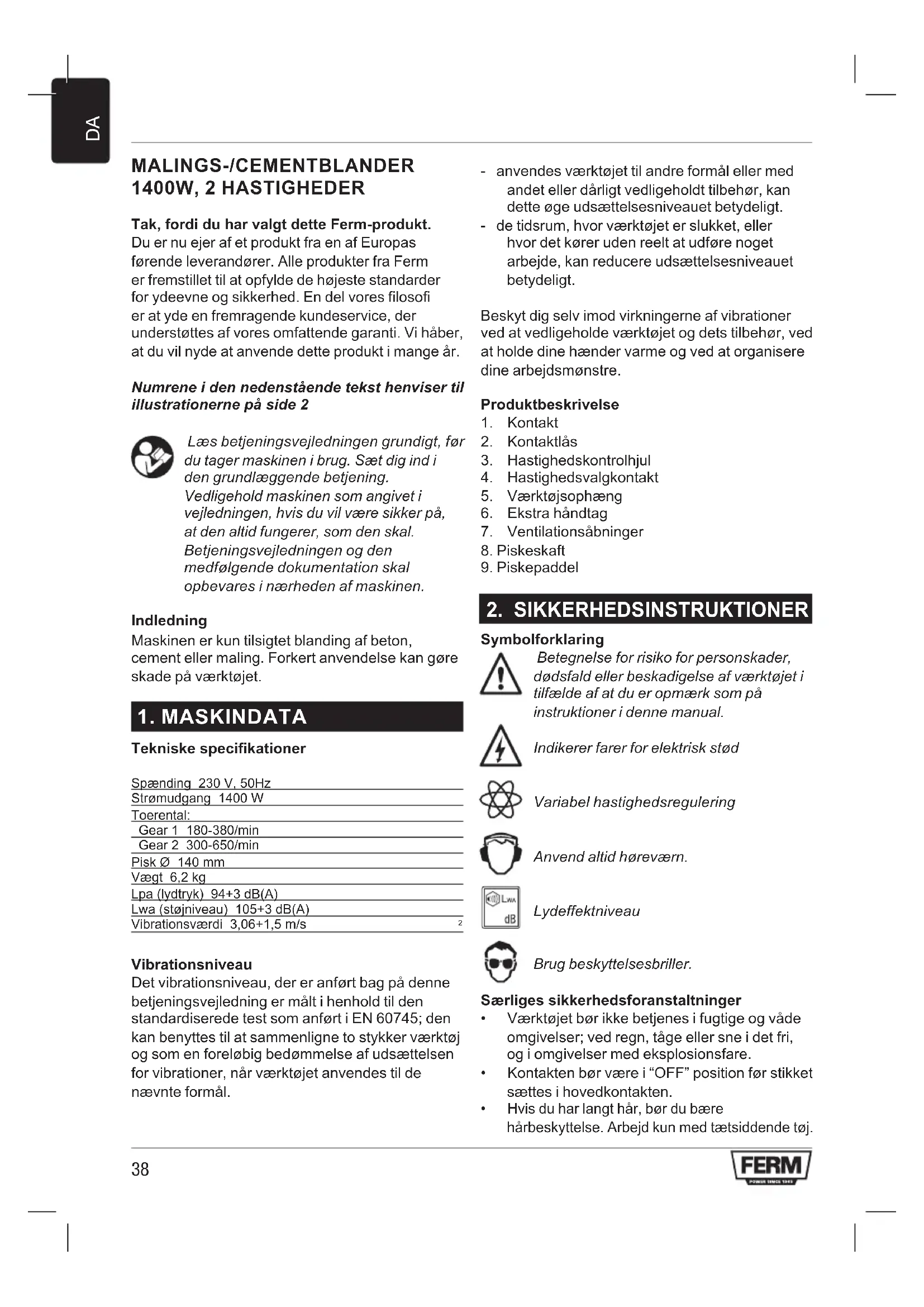 MALINGS-/CEMENTBLANDER 1400W, 2 HASTIGHEDER Tak, fordi du har valgt dette Ferm-produkt. Du er nu ejer af et produkt fra en af Europas førende leverandører. Alle produkter fra Ferm er fremstillet til at opfylde de højeste standarder for ydeevne og sikkerhed. En del vores filosofi er at yde en fremragende kundeservice, der understøttes af vores omfattende garanti. Vi håber, at du vil nyde at anvende dette produkt i mange år. Numrene i den nedenstående tekst henviser til illustrationerne på side 2 Læs betjeningsvejledningen grundigt, før du tager maskinen i brug. Sæt dig ind i den grundlæggende betjening. Vedligehold maskinen som angivet i vejledningen, hvis du vil være sikker på, at den altid fungerer, som den skal. Betjeningsvejledningen og den medfølgende dokumentation skal opbevares i nærheden af maskinen. Indledning Maskinen er kun tilsigtet blanding af beton, cement eller maling. Forkert anvendelse kan gøre skade på værktøjet.