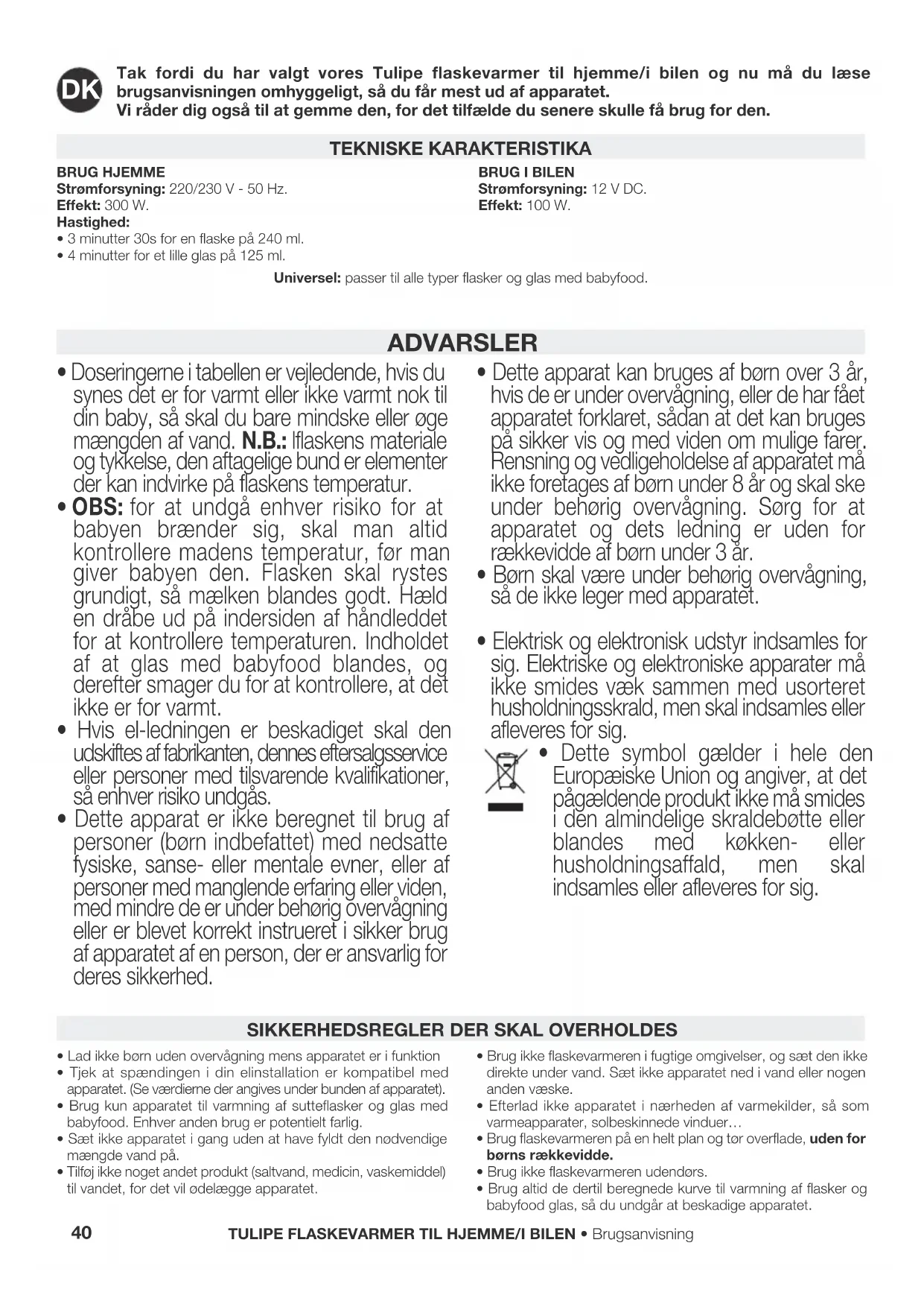 - Dette symbol gælder i hele den Europæiske Union og angiver, at det pågældende produkt ikke må smides i den almindelige skraldebøtte eller blandes med køkken- eller husholdningsaffald, men skal indsamles eller afleveres for sig. BRUG HJEMMEStrømforsyning: 220/230 V - 50 Hz.Effekt: 300 W.Hastighed:• 3 minutter 30s for en flaske på 240 ml.• 4 minutter for et lille glas på 125 ml.BRUG I BILENStrømforsyning: 12 V DC.Effekt: 100 W. TEKNISKE KARAKTERISTIKA Universel: passer til alle typer flasker og glas med babyfood.• Lad ikke flasker og glas med babyfood varme for længe, det kan medvirke til udvikling af bakterier i mælk eller føde.