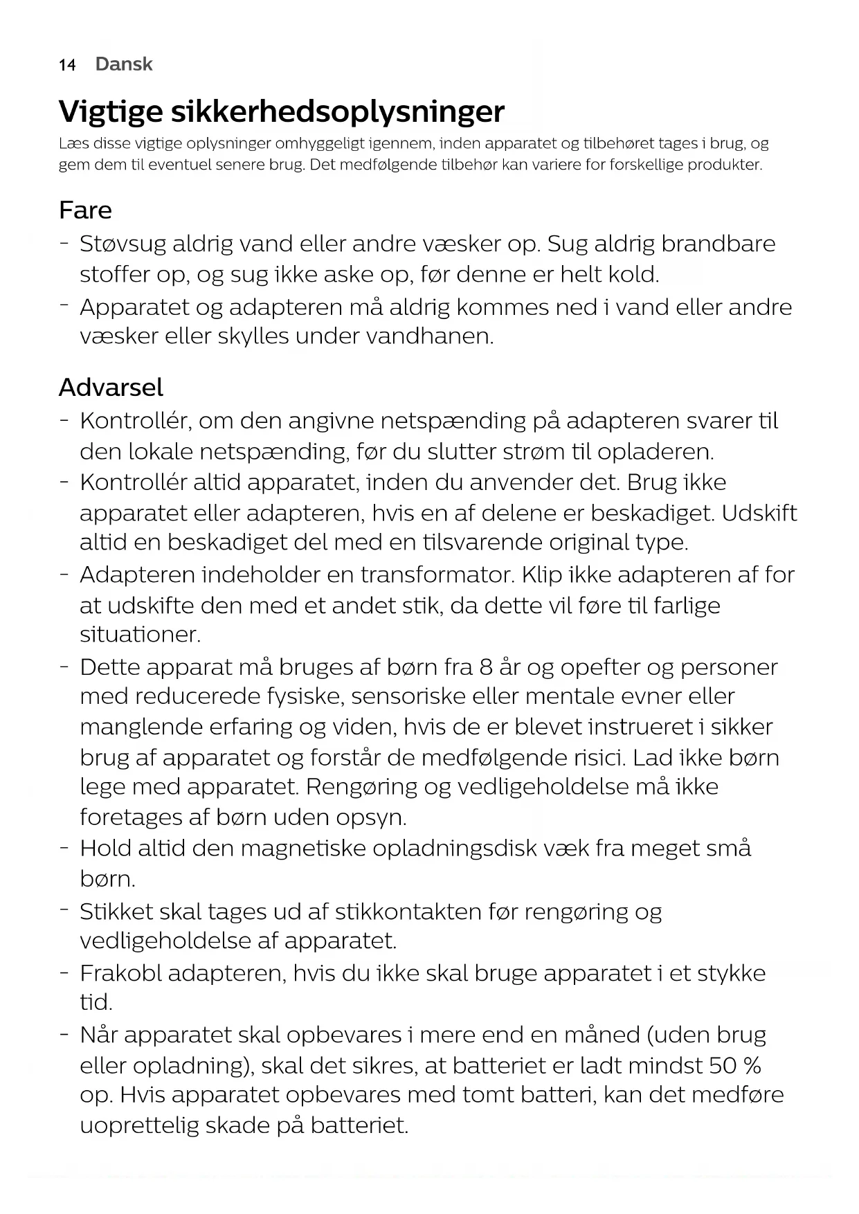 EnglishDansk Vigtige sikkerhedsoplysninger Læs disse vigtige oplysninger omhyggeligt igennem, inden apparatet og tilbehøret tages i brug, oggem dem til eventuel senere brug. Det medfølgende tilbehør kan variere for forskellige produkter. Fare