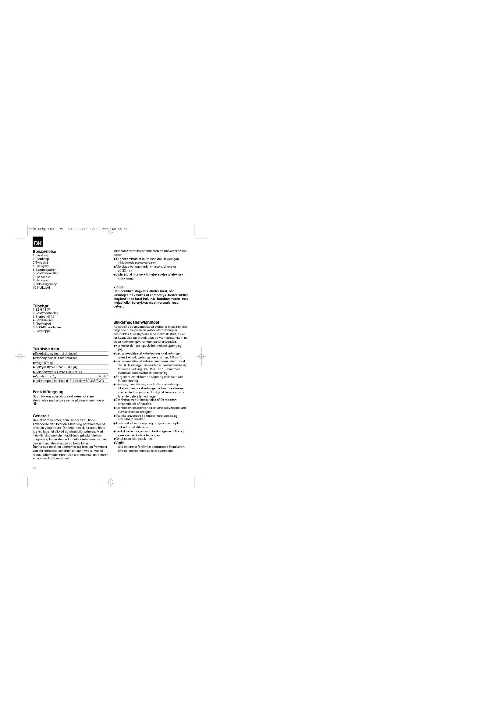 Benævneise 1 Låseknap 2 Startknap 3 Typeskilt 4 Låsegreb 5 Spændepatron 6 Bordybdeanslag 7 Låseskrue 8 Håndgreb 9 Indstillingsknap 10 Netkabel Tilbehør 1 EBH 1100 2 Bordybdeanslag 3 Stenbor Ø 25 4 Spidsmejsel 5 Fladmejsel 6 SDS-Plus-adapter 7 Støvkappe Tekniske data Enkeltslagstyrke: 4,3 J (Joule) Værktøjsholder: Stor notaksel Vægt: 5,9 kg Lydtryksstyrke LPA: 98 dB (A) Lydeffektstyrke LWA: 108,6 dB (A) Vibration a