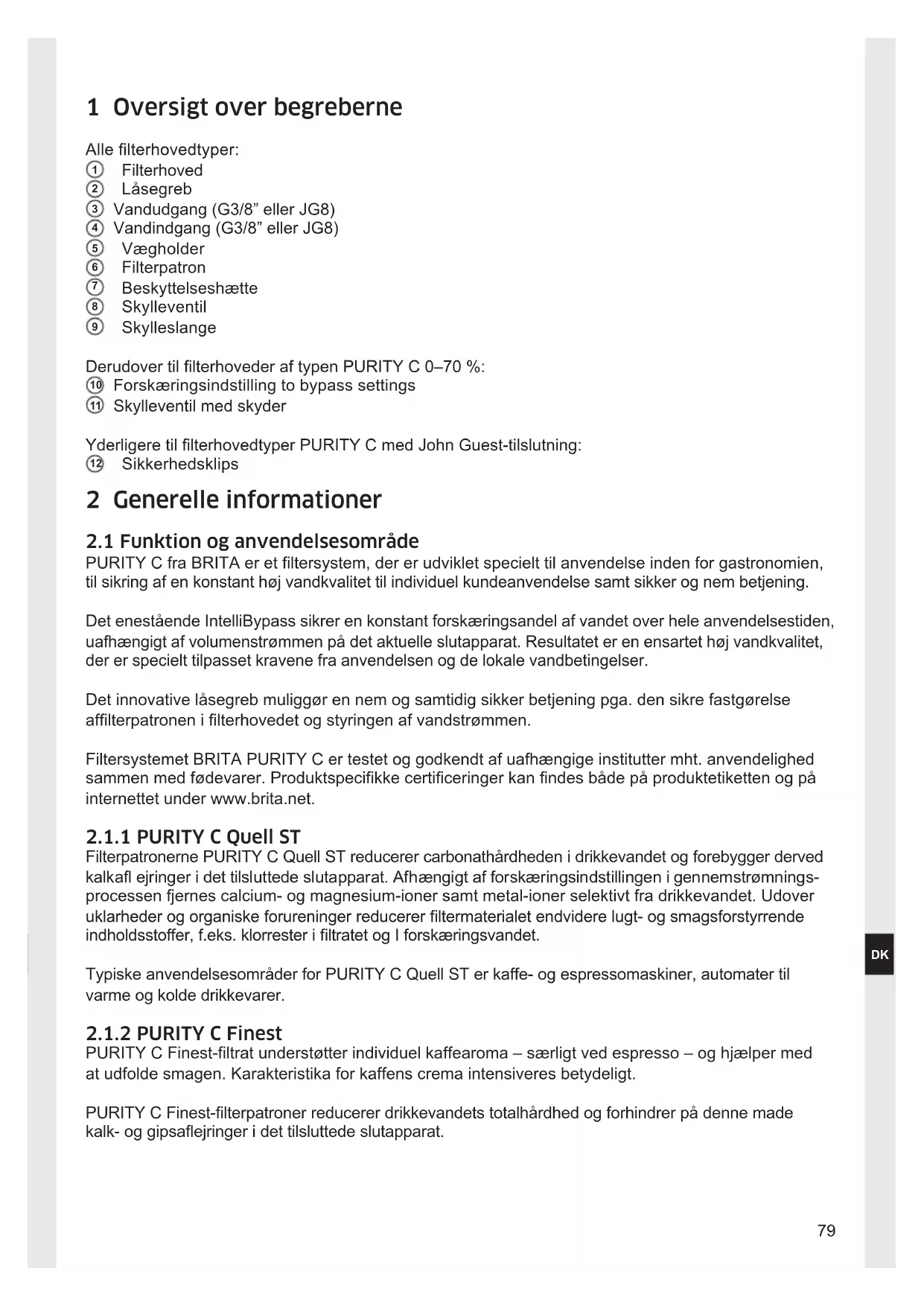 PURITY C fra BRITA er et ltersystem, der er udviklet specielt til anvendelse inden for gastronomien, til sikring af en konstant høj vandkvalitet til individuel kundeanvendelse samt sikker og nem betjening. Det enestående IntelliBypass sikrer en konstant forskæringsandel af vandet over hele anvendelsestiden, uafhængigt af volumenstrømmen på det aktuelle slutapparat. Resultatet er en ensartet høj vandkvalitet, der er specielt tilpasset kravene fra anvendelsen og de lokale vandbetingelser. Det innovative låsegreb muliggør en nem og samtidig sikker betjening pga. den sikre fastgørelse aflterpatronen i lterhovedet og styringen af vandstrømmen. Filtersystemet BRITA PURITY C er testet og godkendt af uafhængige institutter mht. anvendelighed sammen med fødevarer. Produktspecikke certiceringer kan ndes både på produktetiketten og på internettet under www.brita.net.