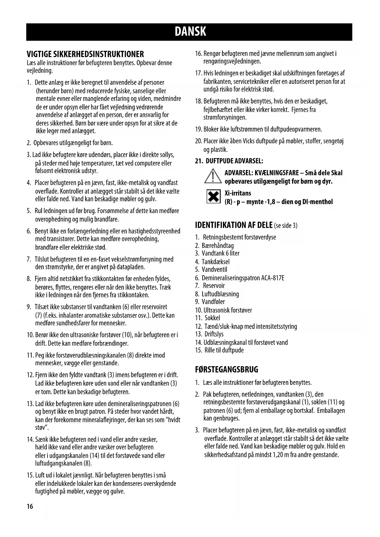 ADVARSEL: KVÆLNINGSFARE – Små dele Skal opbevares utilgængeligt for børn og dyr. Xi-irritans (R) - p – mynte -1,8 – dien og DI-menthol IDENTIFIKATION AF DELE (se side 3)
