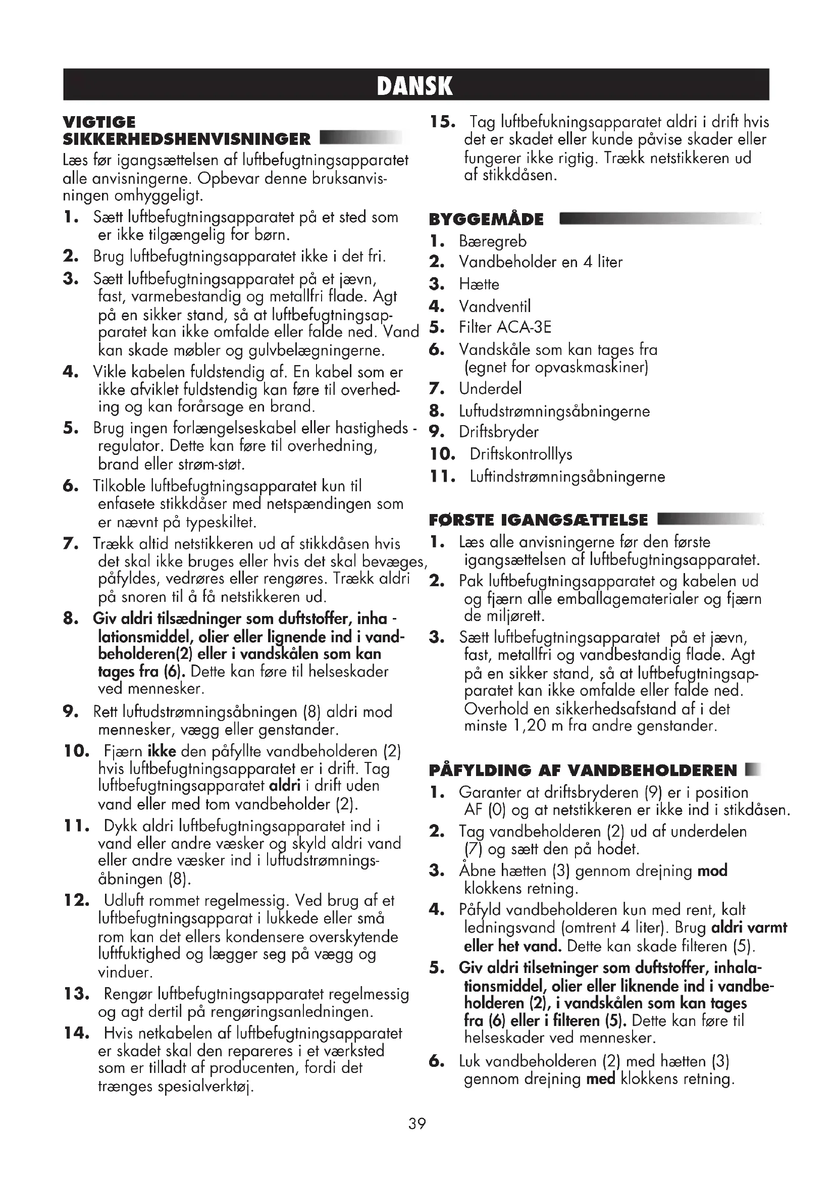 lationsmiddel, olier eller lignende ind i vand- beholderen(2) eller i vandskålen som kan tages fra (6). Dette kan føre til helseskader ved mennesker.
