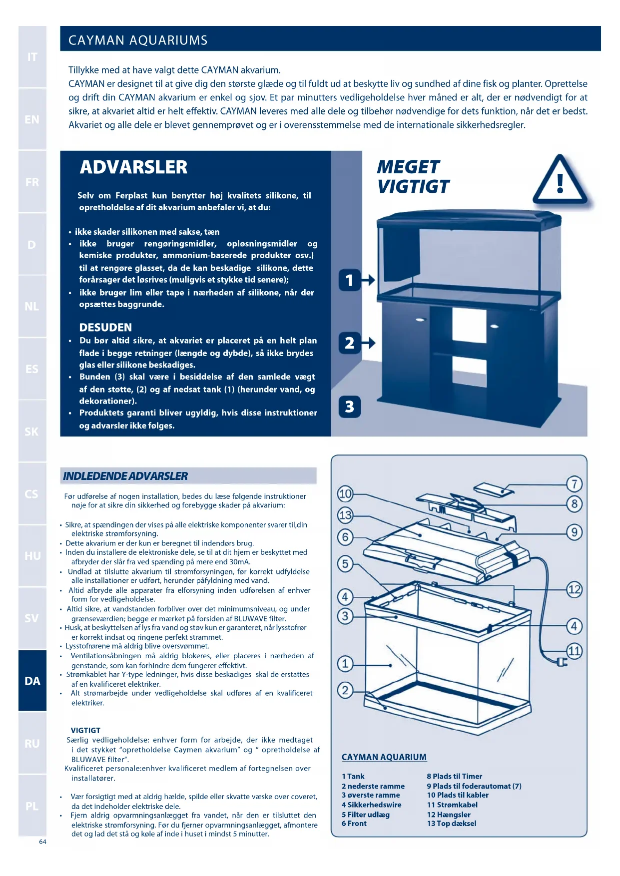 Hver en del af CAYMAN akvarium og Ferplast filtre kan let udskiftes. Disse dele er tilgængelige hos forhandleren, hvor du købte akvariet. En komplet vifte af opdateret Ferplast tilbehør er altid til rådighed for at tilpasse dit akvarium til dine individuelle behov. Alle sele kan erstattes dette sikrer fuld funktionsdygtig stand og sikkerheden af dit produkt. Der må kun anvendes Ferplast originale dele. Installation af andet end Ferplast dele ophæver garantien.