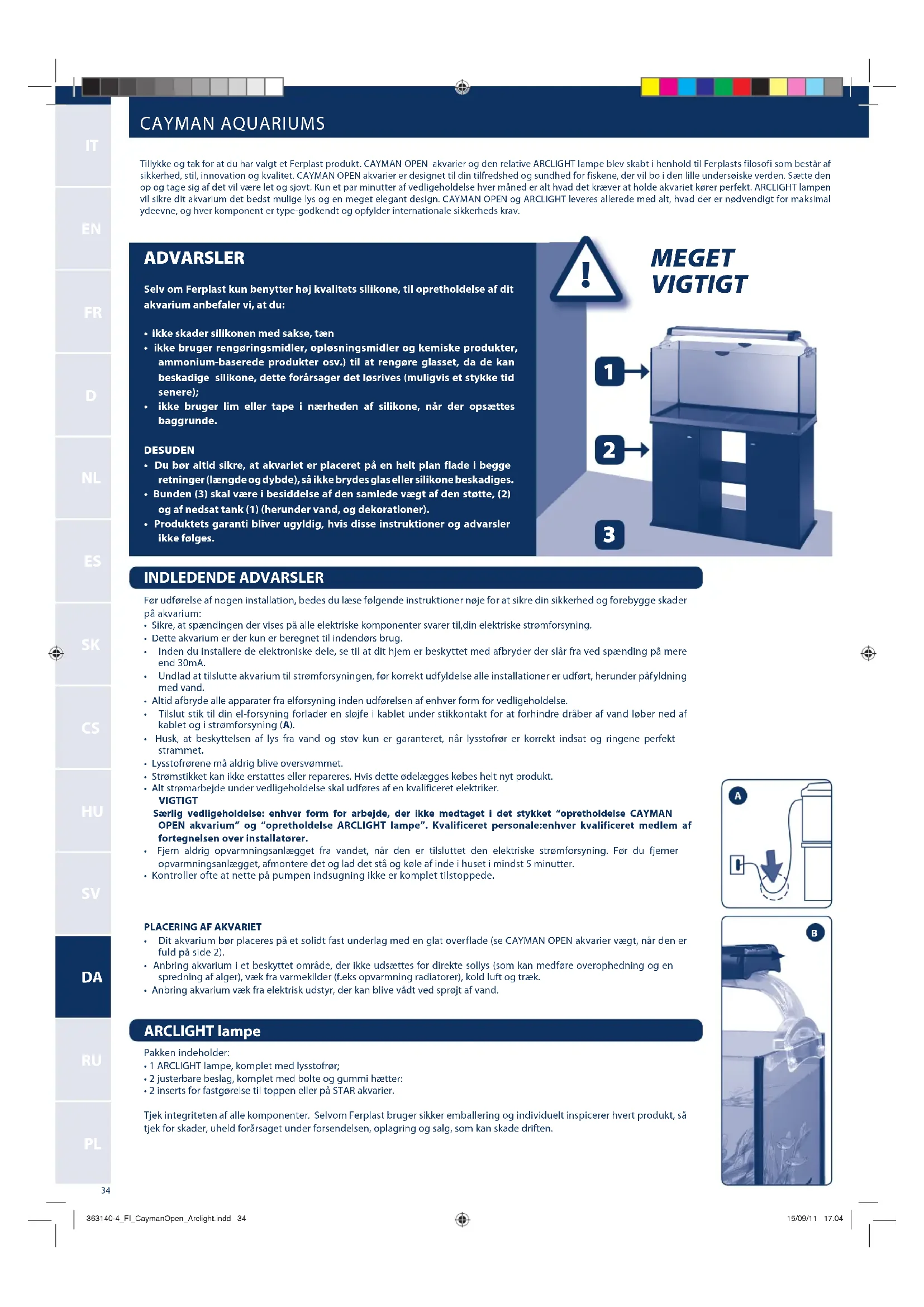 Tillykke og tak for at du har valgt et Ferplast produkt. CAYMAN OPEN akvarier og den relative ARCLIGHT lampe blev skabt i henhold til Ferplasts filosofi som bestar af sikkerhed, stil, innovation og kvalitet. CAYMAN OPEN akvarier er designet til din tilfredshed og sundhed for fiskeene, der vil bo i den lille undersoiske verdien. Sætte den op og tage sig af det vil vare let og sjovt. Kun et par minutner af vedligeholdse hver maned er alt hvad det kræver at holde akvariert körer perfekt. ARCLIGHT lampen vil sikre dit akvarium det bedst mulige lys og en meget elegant design. CAYMAN OPEN og ARCLIGHT leveres allere med alt, hvad der er nodvendigt for maksimal ydeevne, og hvr component er type-godkendt og opfylder internationale sikkerheds krav.