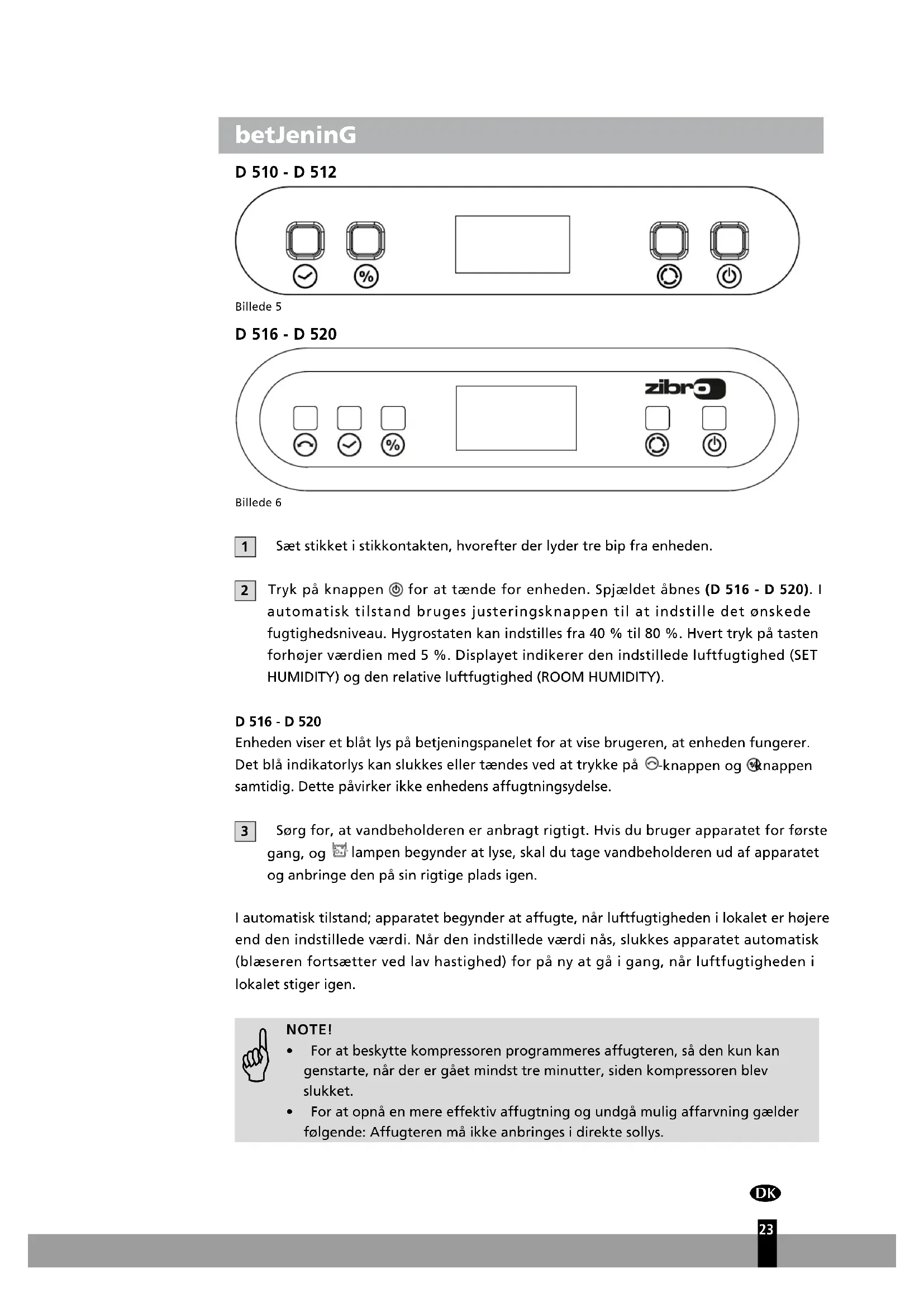 - Foratbeskyttekompressorenprogrammeresaffugteren,sådenkunkangenstarte, når der er gået mindst tre minutter, siden kompressoren blev slukket.• Foratopnåenmereeffektivaffugtningogundgåmuligaffarvninggælderfølgende:Affugterenmåikkeanbringesidirektesollys. D 516 - D 520 D 510 - D 51224