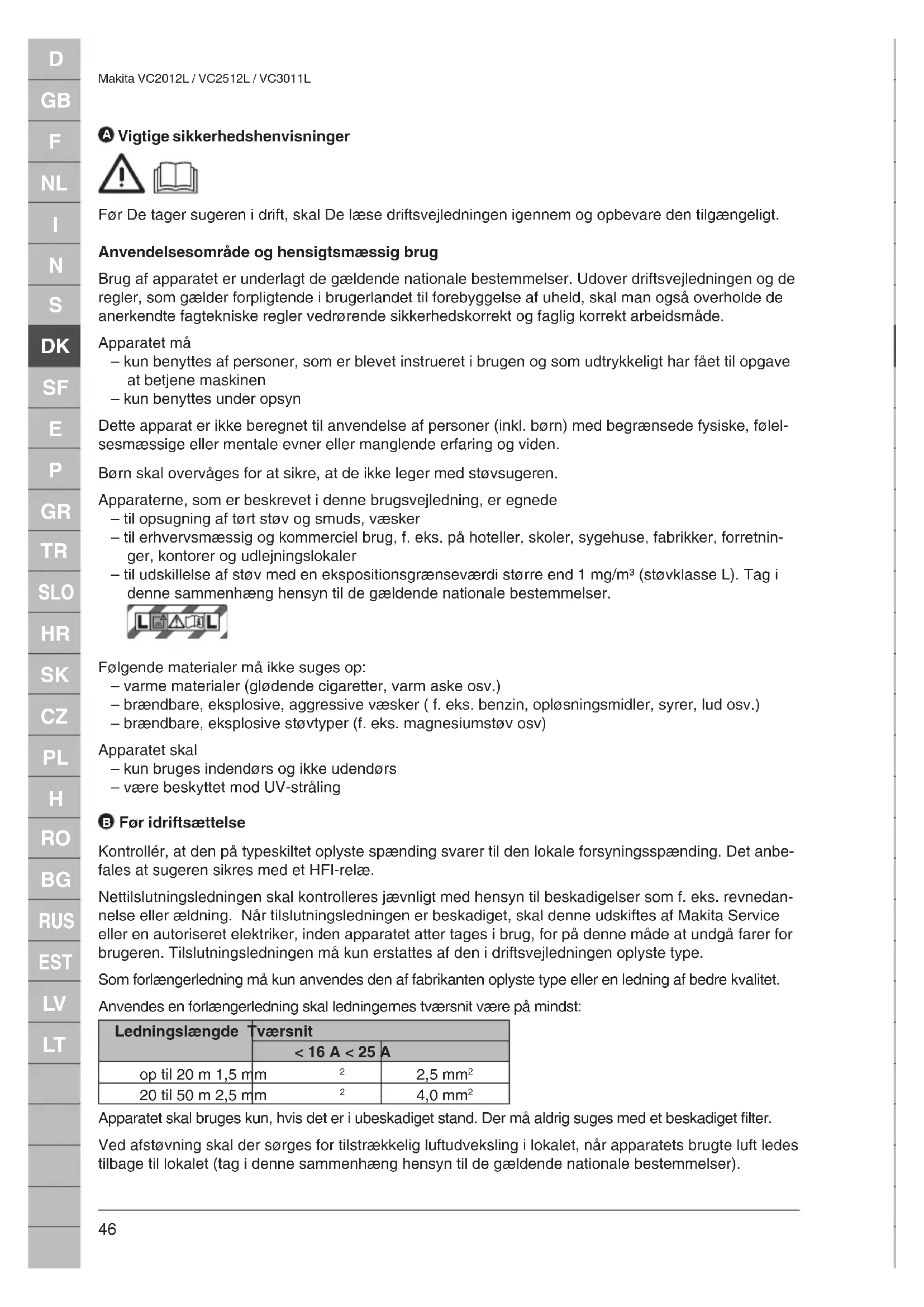Før idriftsættelse Kontrollér, at den på typeskiltet oplyste spænding svarer til den lokale forsyningsspænding. Det anbe- fales at sugeren sikres med et HFI-relæ. Nettilslutningsledningen skal kontrolleres jævnligt med hensyn til beskadigelser som f. eks. revnedan- nelse eller ældning. Når tilslutningsledningen er beskadiget, skal denne udskiftes af Makita Service eller en autoriseret elektriker, inden apparatet atter tages i brug, for på denne måde at undgå farer for brugeren. Tilslutningsledningen må kun erstattes af den i driftsvejledningen oplyste type. Som forlængerledning må kun anvendes den af fabrikanten oplyste type eller en ledning af bedre kvalitet. Anvendes en forlængerledning skal ledningernes tværsnit være på mindst: Ledningslængde Tværsnit < 16 A < 25 A op til 20 m 1,5 mm