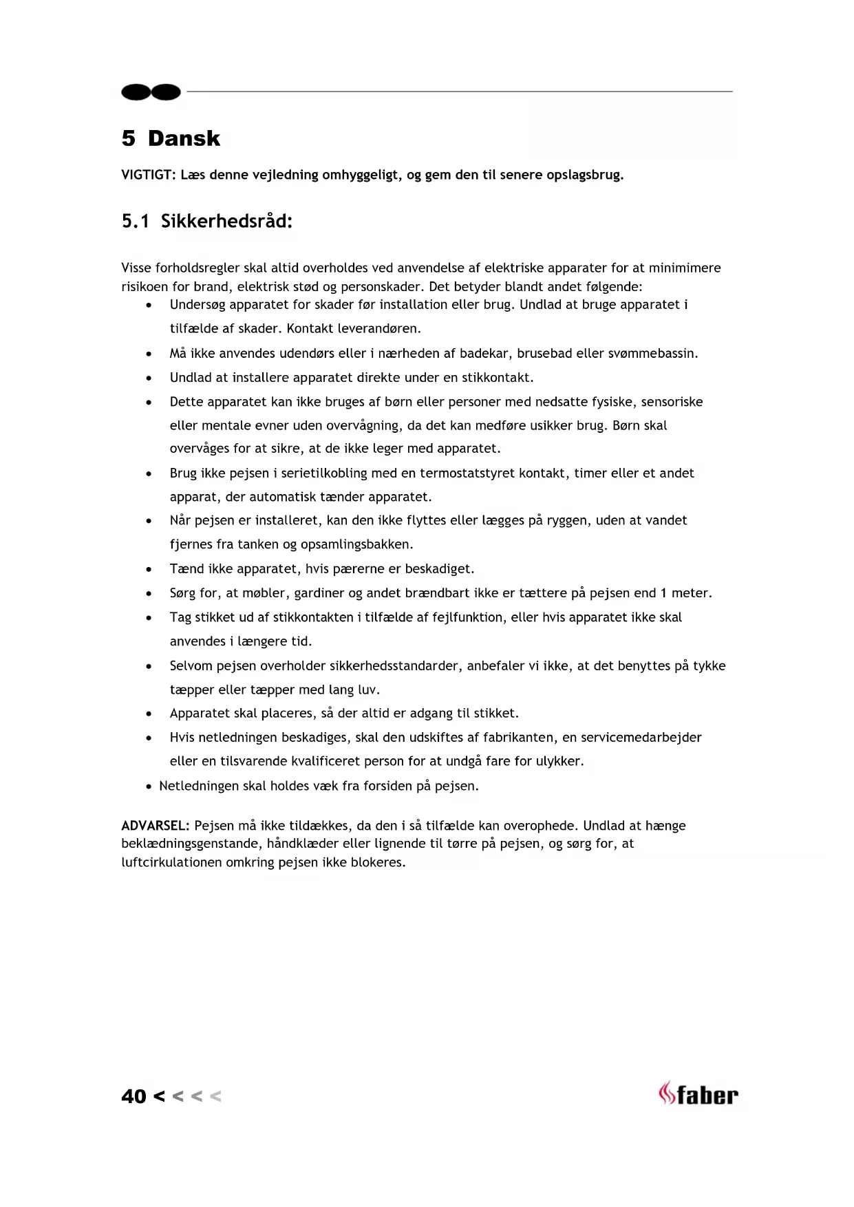 Visse forholdsregler skal altid overholdes ved anvendelse af elektriske apparater for at minimimere risikoen for brand, elektrisk stød og personskader. Det betyder blandt andet følgende: Undersøg apparatet for skader før installation eller brug. Undlad at bruge apparatet i tilfælde af skader. Kontakt leverandøren. Må ikke anvendes udendørs eller i nærheden af badekar, brusebad eller svømmebassin. Undlad at installere apparatet direkte under en stikkontakt. Dette apparatet kan ikke bruges af børn eller personer med nedsatte fysiske, sensoriske eller mentale evner uden overvågning, da det kan medføre usikker brug. Børn skal overvåges for at sikre, at de ikke leger med apparatet. Brug ikke pejsen i serietilkobling med en termostatstyret kontakt, timer eller et andet apparat, der automatisk tænder apparatet. Når pejsen er installeret, kan den ikke flyttes eller lægges på ryggen, uden at vandet fjernes fra tanken og opsamlingsbakken. Tænd ikke apparatet, hvis pærerne er beskadiget. Sørg for, at møbler, gardiner og andet brændbart ikke er tættere på pejsen end 1 meter. Tag stikket ud af stikkontakten i tilfælde af fejlfunktion, eller hvis apparatet ikke skal anvendes i længere tid. Selvom pejsen overholder sikkerhedsstandarder, anbefaler vi ikke, at det benyttes på tykke tæpper eller tæpper med lang luv. Apparatet skal placeres, så der altid er adgang til stikket. Hvis netledningen beskadiges, skal den udskiftes af fabrikanten, en servicemedarbejder eller en tilsvarende kvalificeret person for at undgå fare for ulykker. Netledningen skal holdes væk fra forsiden på pejsen. ADVARSEL: Pejsen må ikke tildækkes, da den i så tilfælde kan overophede. Undlad at hænge beklædningsgenstande, håndklæder eller lignende til tørre på pejsen, og sørg for, at luftcirkulationen omkring pejsen ikke blokeres.41 < < < <