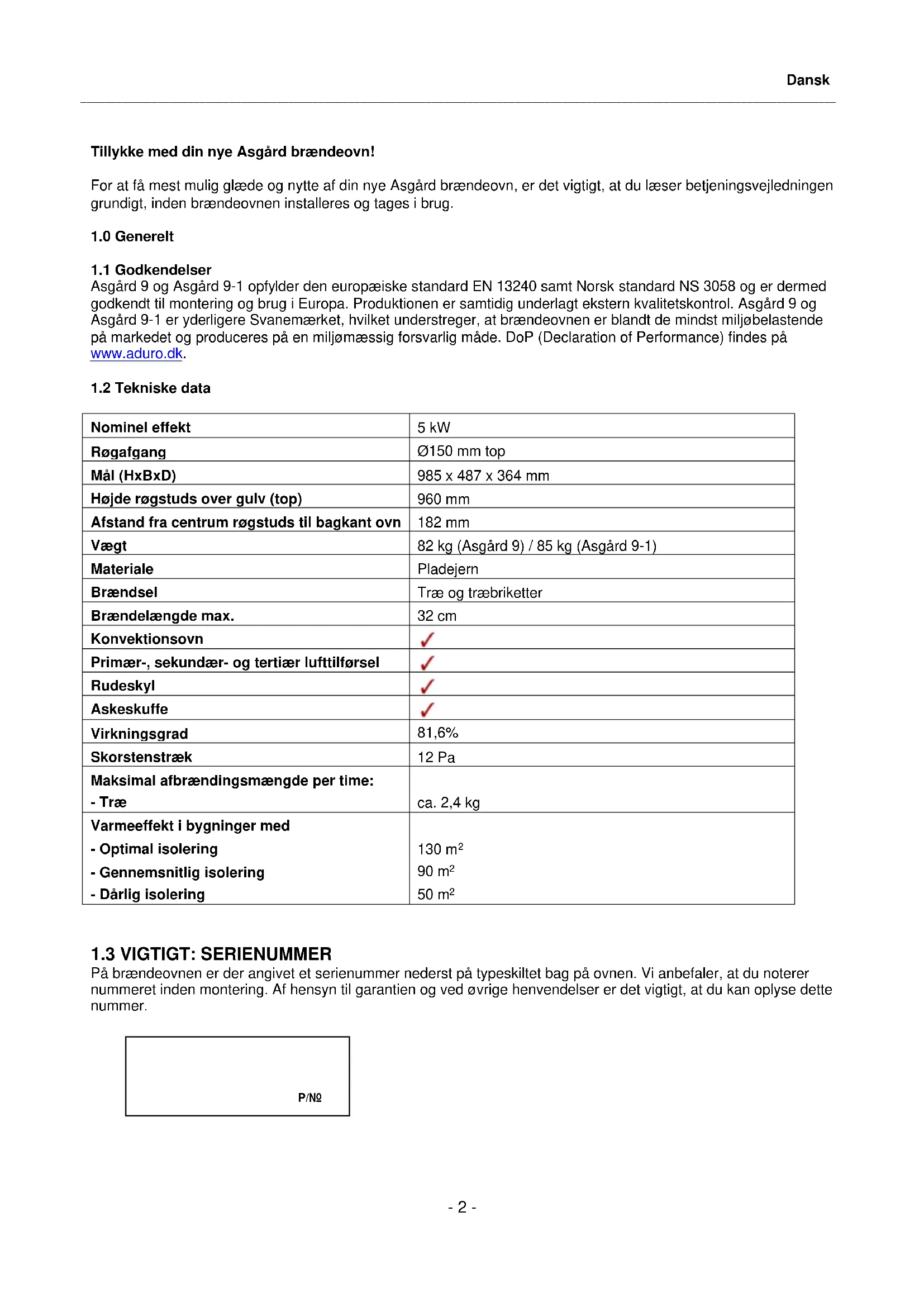 På brændeovnen er der angivet et serienummer nederst på typeskiltet bag på ovnen. Vi anbefaler, at du noterer nummeret inden montering. Af hensyn til garantien og ved øvrige henvendelser er det vigtigt, at du kan oplyse dette nummer. Dansk P/Nr._______________________________________________________________________________________________________________________________