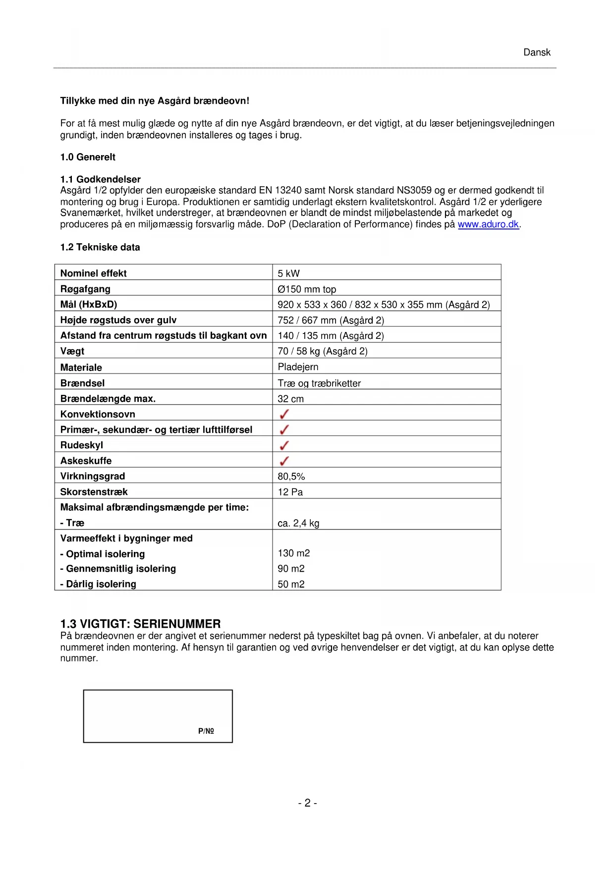 På brændeovnen er der angivet et serienummer nederst på typeskiltet bag på ovnen. Vi anbefaler, at du noterer nummeret inden montering. Af hensyn til garantien og ved øvrige henvendelser er det vigtigt, at du kan oplyse dette nummer. Dansk P/Nr._______________________________________________________________________________________________________________________________