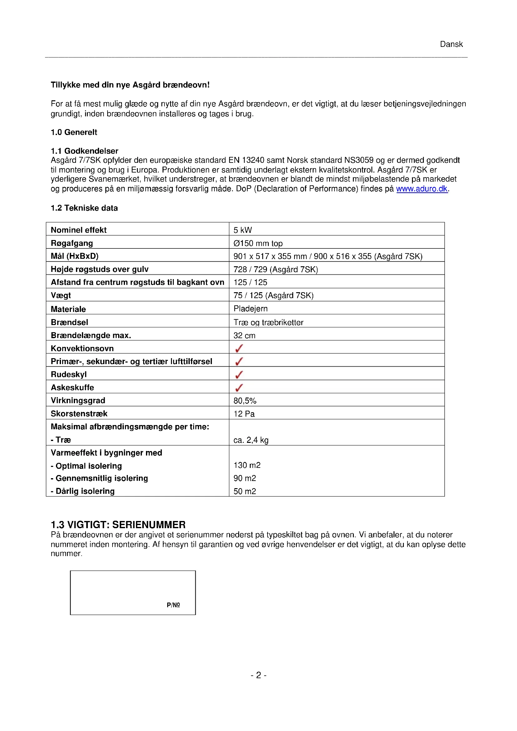 På brændeovnen er der angivet et serienummer nederst på typeskiltet bag på ovnen. Vi anbefaler, at du noterer nummeret inden montering. Af hensyn til garantien og ved øvrige henvendelser er det vigtigt, at du kan oplyse dette nummer. Dansk P/Nr._______________________________________________________________________________________________________________________________