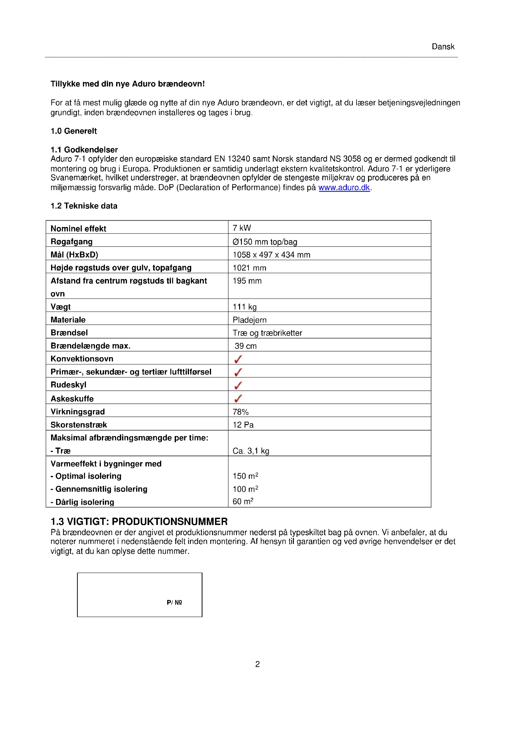 På brændeovnen er der angivet et produktionsnummer nederst på typeskiltet bag på ovnen. Vi anbefaler, at du noterer nummeret i nedenstående felt inden montering. Af hensyn til garantien og ved øvrige henvendelser er det vigtigt, at du kan oplyse dette nummer.