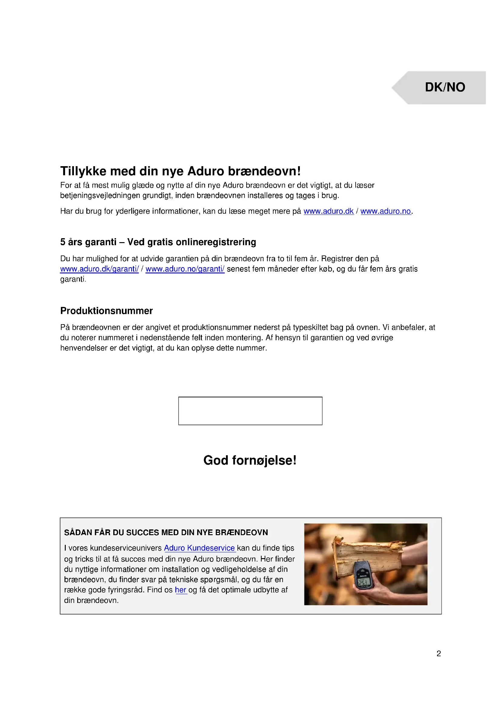 Tillykke med din nye Aduro brændeovn! For at få mest mulig glæde og nytte af din nye Aduro brændeovn er det vigtigt, at du læser betjeningsvejledningen grundigt, inden brændeovnen installeres og tages i brug. Har du brug for yderligere informationer, kan du læse meget mere på www.aduro.dk / www.aduro.no. 5 års garanti – Ved gratis onlineregistrering Du har mulighed for at udvide garantien på din brændeovn fra to til fem år. Registrer den på www.aduro.dk/garanti/ / www.aduro.no/garanti/ senest fem måneder efter køb, og du får fem års gratis garanti. Produktionsnummer På brændeovnen er der angivet et produktionsnummer nederst på typeskiltet bag på ovnen. Vi anbefaler, at du noterer nummeret i nedenstående felt inden montering. Af hensyn til garantien og ved øvrige henvendelser er det vigtigt, at du kan oplyse dette nummer.
