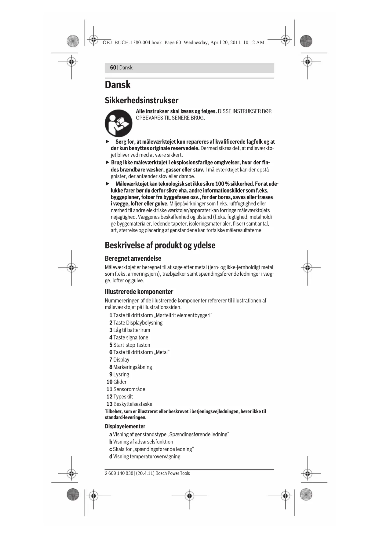 Vægt svarer til EPTA-Procedure 01/2003 289 g *afhængigt af genstandenes driftsform, materiale og størrelse samt undergrundens materiale og tilstand **mindre registreringsdybde ved ikke spændingsførende ledninger f Måleresultatet kan blive mindre nøjagtigt, hvis undergrunden er ufordelagtig. Vær opmærksom på dit måleværktøjs typenummer (på typeskiltet), handelsbetegnelserne for de enkelte måleværktøjer kan variere. Dr. Egbert Schneider Senior Vice President Engineering Dr. Eckerhard Strötgen Head of Product Certification OBJ_BUCH-1380-004.book Page 61 Wednesday, April 20, 2011 10:12 AM62 | Dansk 2 609 140 838 | (20.4.11) Bosch Power Tools Batterivisningen e viser altid den aktuelle batteristatus: – Batteri er helt opladet – Batteri har 2/3 kapacitet eller mindre – Batteri har 1/3 kapacitet eller mindre – Skift venligst batteri f Tag batteriet ud af måleværktøjet, hvis du ikke skal anvende det i længe- re tid. Batteriet kan korrodere eller aflade sig selv, hvis det opbevares i læn- gere tid. Drift f Beskyt måleværktøjet mod fugtighed og direkte solstråler. f Udsæt ikke måleværktøjet for ekstreme temperaturer eller tempera- tursvingninger. Lad det først udtemperere ved store temperatursving- ninger, før det tændes. Ved ekstreme temperaturer eller temperatursving- ninger kan måleværktøjets præcision og visningen i displayet forringes. f Brug eller drift af sendeanlæg som f.eks. WLAN, UMTS, flyradar, sende- master eller mikrobølger i de nære omgivelser kan påvirke målefunktio- nen. Ibrugtagning Tænd/sluk f Sørg for, at sensorområdet 11 ikke er fugtigt, før måleværktøjet tændes. Tør i givet fald måleværktøjet tør med en klud. f Har måleværktøjet været udsat for et stærkt temperaturskift, skal det udtempereres, før det tændes. Måleværktøjet tændes ved at trykke på start-stop-tasten 5. Måleværktøjet slukkes ved at trykke på tænd-sluk-tasten 5 en gang til. Trykkes der ikke på nogen taste på måleværktøjet i ca. 5 min, og opdages der in- gen genstande, slukker måleværktøjet automatisk for at skåne batteriet. Displaybelysning tændes/slukkes Med tasten displaybelysning 2 tændes og slukkes displaybelysningen. Signaltone tændes/slukkes Med tasten signalton 4 tændes og slukkes signaltonen. Er signaltonen slukket, fremkommer visningen l i displayet. Funktion (se Fig. A) Med måleværktøjet kontrolleres sensorområdets undergrund 11 i måleretning z indtil den maks. registreringsdybde (se „Tekniske data“). Måleværktøjet regi- strerer genstande, der er forskellig fra væggens materiale. Bevæg altid måleværktøjet i lige linje med let tryk hen over undergrunden, uden at det løftes væk og uden at trykket ændres. Under målearbejdet skal gliderne 10 altid have kontakt til undergrunden. Målemetode Anbring måleværktøjet på den overflade, der skal undersøges, og bevæg det i x- og y-aksens retning. Kommer måleværktøjet i nærheden af en genstand, for- stærkes udslaget på skalaen f, og ringen 9 lyser gul, fjernes det fra genstanden, forringes udslaget. Over midten på en genstand viser skalaen f det maksimale udslag; ringen 9 lyser rød, og der høres en signaltone. Ved små eller dybtliggen- de genstande kan ringen 9 blive ved med at lyse gul og signaltonen udeblive. f Bredere genstande vises ikke i hele deres bredde med lysringen eller sig- naltonen. Ønsker man at lokalisere genstanden mere nøjagtigt, bevæges måleværktøjet flere gange (3x) frem og tilbage hen over genstanden. OBJ_BUCH-1380-004.book Page 62 Wednesday, April 20, 2011 10:12 AMDansk | 63 Bosch Power Tools 2 609 140 838 | (20.4.11) Bredere genstande i undergrunden registreres af et varigt, højt udslag på skala- en f. Ringen 9 lyser gul. Varigheden af det høje udslag svarer ca. til genstandens bredde. Søges meget små eller dybtliggende genstande, og slår akalaen f kun meget lidt ud, skal du bevæge måleværktøjet flere gange vandret (x-akse) og lodret (y-akse) hen over genstanden. f Før du borer, saver eller fræser i væggen, bør du sikre dig mod farer vha. an- dre informationskilder. Da måleresultaterne kan påvirkes af omgivelserne eller væggens beskaffenhed, er der fare, selv om indikatoren ikke viser nogen gen- stand i sensorområdet (der høres ingen signaltone og lysringen 9 lyser grøn). Funktioner De bedste måleresultater opnås ved at vælge den rigtige driftsform. Den maksi- male registreringsdybde for metalgenstande nås i driftsformen „Metal“. Den maksimale registreringsdybde for ikke metalliske genstande opnås i driftsfor- men „Mørtelfrit elementbyggeri“. Spændingsførende ledninger registreres i enhver driftsform. Mørtelfrit elementbyggeri Driftsformen „Mørtelfrit elementbyggeri“ er egnet til at finde træ- og metal- genstande samt spændingsførende ledninger i gipsvægge. Tryk på tasten 1 for at aktivere driftsformen „Mørtelfrit elementbyggeri“. Vis- ningen h lyser. Så snart måleværktøjet anbringes på den undergrund, der skal undersøges, lyser ringen 9 grøn og signaliserer derved, at det er klart til at måle. I driftsformen „Mørtelfrit elementbyggeri“ findes og vises alle former for gen- stande: – ikke metallisk f.eks. træbjælker – magnetisk f.eks. armeringsjern – ikke magnetisk, men metallisk, f.eks. kobberrør – spændingsførende f.eks. strømledning Bemærk: I driftsformen „Mørtelfrit elementbyggeri“ vises ikke kun genstande af træ og metal samt spændingsførende ledninger, men også andre genstande som f.eks. kunststofrør, der er fyldt med vand. I displayet 7 fremkommer til dis- se genstande visningen g til genstande uden metal. Søm og skruer i undergrunden kan medføre, at en træbjælke vises som en metal- genstand i displayet. Ses i displayet 7 et varigt, højt udslag på skalaen f og skalaen c, start da målepro- cessen på ny ved at anbringe måleværktøjet et andet sted på undergrunden. Signaliserer lysringen 9 ikke noget målebere