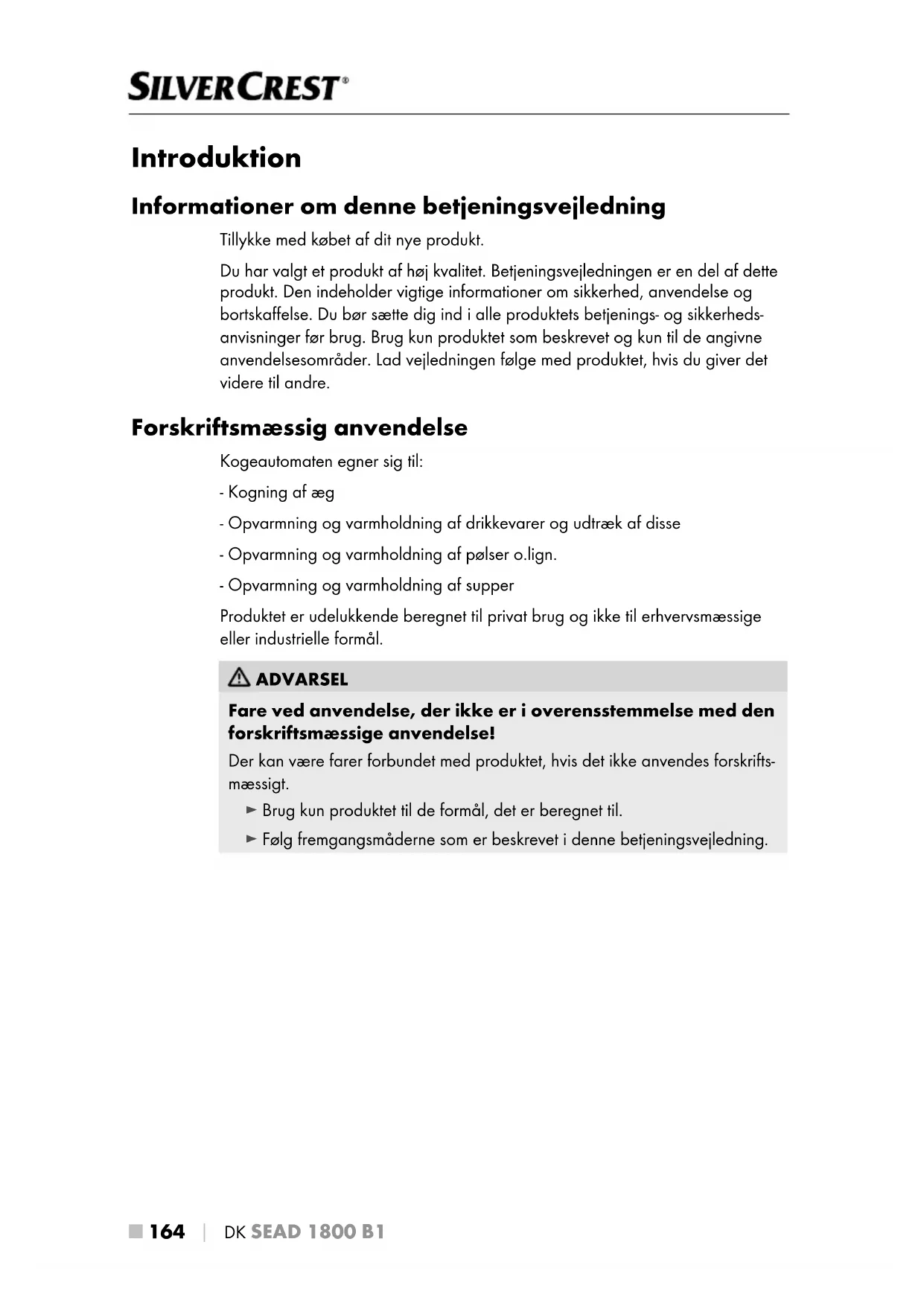 Introduktion Informationer om denne betjeningsvejledning Tillykke med købet af dit nye produkt. Du har valgt et produkt af høj kvalitet. Betjeningsvejledningen er en del af dette produkt. Den indeholder vigtige informationer om sikkerhed, anvendelse og bortskaffelse. Du bør sætte dig ind i alle produktets betjenings- og sikkerheds- anvisninger før brug. Brug kun produktet som beskrevet og kun til de angivne anvendelsesområder. Lad vejledningen følge med produktet, hvis du giver det videre til andre. Forskriftsmæssig anvendelse Kogeautomaten egner sig til: - Kogning af æg - Opvarmning og varmholdning af drikkevarer og udtræk af disse - Opvarmning og varmholdning af pølser o.lign. - Opvarmning og varmholdning af supper Produktet er udelukkende beregnet til privat brug og ikke til erhvervsmæssige eller industrielle formål. ADVARSEL Fare ved anvendelse, der ikke er i overensstemmelse med den forskriftsmæssige anvendelse! Der kan være farer forbundet med produktet, hvis det ikke anvendes forskrifts- mæssigt. ► Brug kun produktet til de formål, det er beregnet til. ► Følg fremgangsmåderne som er beskrevet i denne betjeningsvejledning. IB_444431_SEAD1800B1_LB8.indb 164 23.10.2023 13:24:51DK