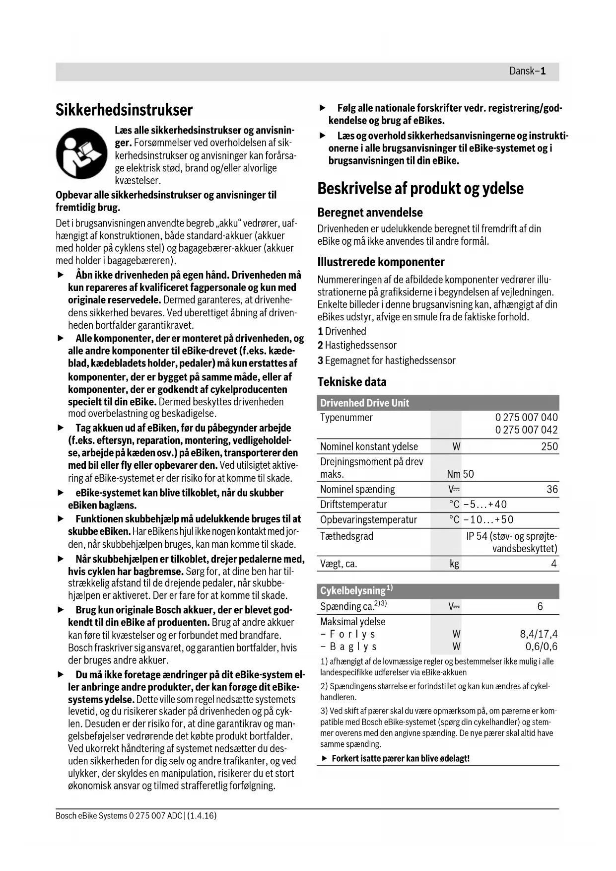 - Motoreffekten kan afvige ved enkelte udførelser.Dansk–3 Bosch eBike Systems 0 275 007 ADC | (1.4.16) Skubbehjælp tændes/slukkes Skubbehjælpen hjælper dig med at skubbe eBiken. Hastighe- den i denne funktion afhænger af det valgte gear og kan kom- me op på maks. 6 km/timen. Jo lavere det valgte gear er, des- to mindre er hastigheden i funktionen skubbehjælp (ved fuld ydelse). Funktionen skubbehjælp må udelukkende bruges til at skubbe eBiken. Har eBikens hjul ikke nogen kontakt med jorden, når skubbehjælpen bruges, kan man komme til skade. For at aktivere skubbehjælpen skal du trykke kort på tasten „WALK“ på din cykelcomputer. Efter aktiveringen trykker du på tasten„+“ inden for 3 sek. og holder den nede. eBikens drev tilkobles. Bemærk: Skubbehjælpen kan ikke aktiveres i understøtnings- niveauet „OFF“. Skubbehjælpen frakobles, når en af følgende hændelser indtræffer: –Du slipper tasten„+“, – eBikens hjul blokeres (f.eks. hvis man bremser eller støder på en forhindring), – hastigheden overskrider 6 km/h. Bemærk: Ved nogle systemer kan skubbehjælpen startes direkte ved at trykke på „WALK“-tasten. Friløbsfunktion (ekstraudstyr) På cykler med friløbsfunktion drejer pedalerne med rundt, når skubbehjælpen er tilkoblet. Hvis de roterende pedaler blokeres, frakobles skubbehjælpen. Tænd/sluk af cykelbelysning I den udførelse, hvor kørelyset fødes via eBike-systemet, kan du via cykelcomputeren samtidig tænde og slukke forlys og baglys. Henvisninger vedr. kørsel med eBike-systemet Hvornår arbejder eBike-drevet? eBike-drevet understøtter dig under kørslen, så længe du træ- der i pedalerne. Understøtningen fungerer kun, så længe der trædes i pedalerne. Motoreffekten afhænger altid af den kraft, der investeres, når der trædes i pedalerne. Investerer du lidt kraft, er understøtningen ikke så stor, som hvis du investerer meget kraft. Det gælder uafhængigt af un- derstøtningsniveauet. eBike-drevet slukker automatisk ved hastigheder over 25 km/h. Underskrider hastigheden 25 km/h, står drevet igen automatisk til rådighed. En undtagelse gælder for funktionen skubbehjælp, hvor eBiken kan skubbes med lav hastighed uden at træde på pedalerne. Ved brug af skubbehjælpen kan pedalerne dreje med. Du kan til enhver tid bruge eBike som en almindelig cykel, og- så uden understøtning; dette gøres ved at slukke for eBike-sy- stemet eller ved at stille understøtningsniveauet på „OFF“. Det samme gælder, hvis akkuen er tom. Samspil mellem eBike-systemet og gearet Også med eBike-drevet bør du bruge gearsystemet som på en normal cykel (læs brugsanvisningen til din eBike). Uafhængigt af gearsystemets type tilrådes det af afbryde trædningen kort under gearskiftet. Derved gøres det nem- mere at skifte gear og drivstrengen slides ikke så hurtigt. Vælges det rigtige gear, kan du ved ensblivende kraftforbrug øge hastigheden og rækkevidden. De første erfaringer Det anbefales at samle de første anbefalinger med eBike på gader og veje med lidt trafik. Afprøv forskellige understøtningsniveauer. Begynd med det laveste understøtningsniveau. Så snart du føler dig sikker, kan du køre ud i trafikken med din eBike som med enhver an- den cykel. Test rækkevidden for din eBike under forskellige betingelser, før du planlægger længere og mere krævende ture. Påvirkninger af rækkevidden Rækkevidden påvirkes af mange faktorer, som f.eks.: – Understøtningsniveau –Hastighed –Gearskifter – Dæktype og dæktryk – Akkuens alder og vedligeholdelsestilstand – Strækningsprofil (stigninger) og -beskaffenhed (køreba- nens belægning) – Modvind og omgivelsestemperatur – Vægt af eBike, fører og bagage. Derfor er det ikke muligt at forudsige rækkevidden præcist, før man starter på en tur samt under kørsel. Generelt gælder imidlertid følgende: –Ved konstant understøtningsniveau fra eBike-drevet: Jo mindre muskelkraft du skal bruge, for at komme op på en bestemt hastighed (f.eks. ved optimal anvendelse af gear- skiftet), desto mindre energi vil eBike-drevet bruge, og desto større bliver en rækkevidden med en akkuopladning. –Jo højere understøtningsniveauet vælges ved ellers ens betingelser, desto kortere er rækkevidden. Omhyggelig pasning af din eBike Vær opmærksom på drifts- og oplagringstemperaturerne for eBike-komponenterne. Beskyt drivenhed, cykelcomputer og akku mod ekstreme temperaturer (f.eks. ved intensivt sollys uden samtidig ventilation). Komponenterne (især akkuen) kan blive beskadiget af ekstreme temperaturer.Dansk–4 0 275 007 ADC | (1.4.16) Bosch eBike Systems Vedligeholdelse og service Vedligeholdelse og rengøring Ved skift af pærer skal du være opmærksom på, om pærerne er kompatible med Bosch eBike-systemet (spørg din cykel- handler) og stemmer overens med den angivne spænding. De nye pærer skal altid have samme spænding. Alle komponenter inklusive drivenheden må ikke dyppes i vand eller rengøres med vand under tryk. Få udført en teknisk kontrol af dit eBike-system mindst en gang årligt (bl.a. mekanik, systemsoftwarens aktualitet). Til service eller reparation af eBike bedes du kontakte en autoriseret cykelforhandler. Kundeservice og brugerrådgivning Ved alle spørgsmål vedr. eBike-systemet og dets komponen- ter bedes du kontakte en autoriseret cykelforhandler. Kontaktdata for autoriserede cykelforhandlere findes på internetsiden www.bosch-ebike.com Bortskaffelse Drivenhed, cykelcomputer inkl. betjeningsenhed, akku, hastighedssensor, tilbehør og emballage skal indsamles og genbruges iht. gældende miljøfor- skrifter. Smid ikke eBikes og deres komponenter ud sammen med det almindelige husholdningsaffald! Gælder kun i EU-lande: Iht. det europæiske direktiv 2012/19/EU skal kasseret elektroværktøj og iht. det europæiske direktiv 2006/66/EF skal defekte eller opbrugte akkuer/batterier indsamles separat og genbru- ges iht. gældende miljøforskrifter. 