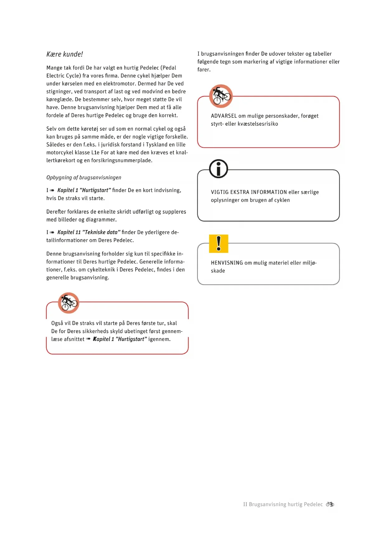 Kapitel 1 ”Hurtigstart” igennem. I brugsanvisningen nder De udover tekster og tabeller følgende tegn som markering af vigtige informationer eller farer. ADVARSEL om mulige personskader, forøget styrt- eller kvæstelsesrisiko VIGTIG EKSTRA INFORMATION eller særlige oplysninger om brugen af cyklen HENVISNING om mulig materiel eller miljø- skade4 II Brugsanvisning hurtig Pedelec