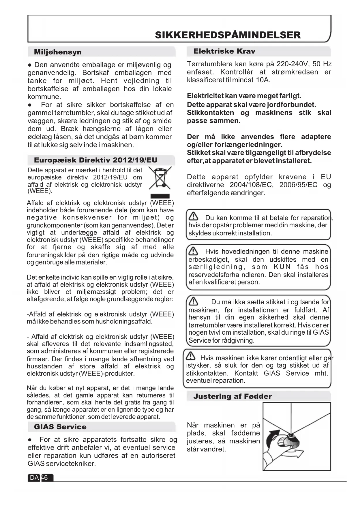45DA 46 SIKKERHEDSPÅMINDELSER Europæisk Direktiv 2012/19/EU ● For at sikre apparatets fortsatte sikre og effektive drift anbefaler vi, at eventuel service eller reparation kun udføres af en autoriseret GIAS servicetekniker. GIAS Service Hvis maskinen ikke kører ordentligt eller går istykker, så sluk for den og tag stikket ud af stikkontakten. Kontakt GIAS Service mht. eventuel reparation. ● Den anvendte emballage er miljøvenlig og genanvendelig. Bortskaf emballagen med tanke for miljøet. Hent vejledning til bortskaffelse af emballagen hos din lokale kommune. ● For at sikre sikker bortskaffelse af en gammel tørretumbler, skal du tage stikket ud af væggen, skære ledningen og stik af og smide dem ud. Bræk hængslerne af lågen eller ødelæg låsen, så det undgås at børn kommer til at lukke sig selv inde i maskinen. Miljøhensyn Tørretumblere kan køre på 220-240V, 50 Hz enfaset. Kontrollér at strømkredsen er klassificeret til mindst 10A. Elektricitet kan være meget farligt. Dette apparat skal være jordforbundet. Stikkontakten og maskinens stik skal passe sammen. Der må ikke anvendes flere adaptere og/eller forlængerledninger. Stikket skal være tilgængeligt til afbrydelse efter,at apparatet er blevet installeret. Dette apparat opfylder kravene i EU direktiverne 2004/108/EC, 2006/95/EC og efterfølgende ændringer. Elektriske Krav Hvis hovedledningen til denne maskine erbeskadiget, skal den udskiftes med en særligledning, som KUN fås hos reservedelsforha ndleren. Den skal installeres af en kvalificeret person. Du kan komme til at betale for reparation, hvis der opstår problemer med din maskine, der skyldes ukorrekt installation. Når maskinen er på plads, skal fødderne justeres, så maskinen står vandret. Justering af ødderF Du må ikke sætte stikket i og tænde for maskinen, før installationen er fuldført. Af hensyn til din egen sikkerhed skal denne tørretumbler være installeret korrekt. Hvis der er nogen tvivl om installation, skal du ringe til GIAS Service for rådgivning. Dette apparat er mærket i henhold til det europæiske direktiv 2012/19/EU om affald af elektrisk og elektronisk udstyr (WEEE). Affald af elektrisk og elektronisk udstyr (WEEE) indeholder både forurenende dele (som kan have negative konsekvenser for miljøet) og grundkomponenter (som kan genanvendes). Det er vigtigt at underlægge affald af elektrisk og elektronisk udstyr (WEEE) specifikke behandlinger for at fjerne og skaffe sig af med alle forureningskilder på den rigtige måde og udvinde og genbruge alle materialer. Det enkelte individ kan spille en vigtig rolle i at sikre, at affald af elektrisk og elektronisk udstyr (WEEE) ikke bliver et miljømæssigt problem; det er altafgørende, at følge nogle grundlæggende regler: -Affald af elektrisk og elektronisk udstyr (WEEE) må ikke behandles som husholdningsaffald. - Affald af elektrisk og elektronisk udstyr (WEEE) skal afleveres til det relevante indsamlingssted, som administreres af kommunen eller registrerede firmaer. Der findes i mange lande afhentning ved husstanden af store affald af elektrisk og elektronisk udstyr (WEEE)-produkter. Når du køber et nyt apparat, er det i mange lande således, at det gamle apparat kan returneres til forhandleren, som skal hente det gratis fra gang til gang, så længe apparatet er en lignende type og har de samme funktioner, som det leverede apparat.Det er vigtigt at benytte en aftræksslange til at lede den varme fugtige luft væk fra tørretumbleren, med mindre tørretumbleren er placeret i et åbent rum med god luftcirkulation omkring. Recirkulation af den fugtige luft vil beskytte fortsat effektiv funktion af tørretumbleren. Slangen tilsluttes maskinen som vist. Slangen kan monteres, så luften udledes gennem et hul i væggen eller vis et åbent vindue eller en åben dør. Slangens diameter er 110 mm og har en rækkevidde på 1,8 meter. De følgende instruktioner skal følges, når aftræksslangen monteres. ⌧ Benyt ikke to slanger i forlængelse af hinanden, da tørretumblerens funktion herved vil blive reduceret. ⌧ Sørg for, at luftgennemstrømningen i slangen ikke mindskes, f.eks. hvis der laves et knæk på slangen eller hvis den monteres til en samling med en mindre diameter i væghullet. ⌧ Undgå at give slangen U-formede kurver, da dette vil forhindre luftgennemstrømningen og øge risikoen for, at der samles vand i slangen. ⌧ Tjek regelmæssigt slangen for at fjerne eventuelt ophobede rester eller vand der kan have samlet sig i den. Den følgende illustration giver et eksempel på god og dårliginstallation.