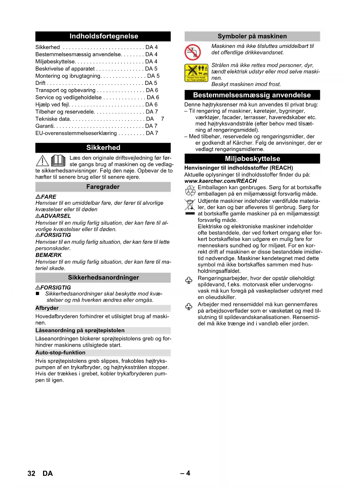 90 dB(A) O fabricante reserva-se o direito de proceder a quaisquer altera- ções técnicas. Garantia Declaração UE de conformidade Produto: Lavadora de alta pressão Tipo: 1.673-xxx Respectivas Directrizes da UE 2000/14/CE 2014/30/UE 2006/42/CE (+2009/127/CE) 2011/65/UE Normas harmonizadas aplicadas EN 50581 EN 55014–1: 2006+A1: 2009+A2: 2011 EN 55014–2: 2015 EN 60335–1 EN 60335–2–79 EN 61000–3–2: 2014 EN 61000–3–3: 2013 EN 62233: 2008 Processo aplicado de avaliação de conformidade 2000/14/CE: Anexo V Nível de potência acústica dB(A) Medido: 88 Garantido: 90 Winnenden, 2016/08/01 CEO Head of Approbation 31PT– 4 Læs den originale driftsvejledning før før- ste gangs brug af maskinen og de vedlag- te sikkerhedsanvisninger. Følg den nøje. Opbevar de to hæfter til senere brug eller til senere ejere. FARE Henviser til en umiddelbar fare, der fører til alvorlige kvæstelser eller til døden 몇 ADVARSEL Henviser til en mulig farlig situation, der kan føre til al- vorlige kvæstelser eller til døden. 몇 FORSIGTIG Henviser til en mulig farlig situation, der kan føre til lette personskader. BEMÆRK Henviser til en mulig farlig situation, der kan føre til ma- teriel skade. 몇 FORSIGTIG Sikkerhedsanordninger skal beskytte mod kvæ- stelser og må hverken ændres eller omgås. Hovedafbryderen forhindrer et utilsigtet brug af maski- nen. Låseanordningen blokerer sprøjtepistolens greb og for- hindrer maskinens utilsigtede start. Hvis sprøjtepistolens greb slippes, frakobles højtryks- pumpen af en trykafbryder, og højtryksstrålen stopper. Hvis der trækkes i grebet, kobler trykafbryderen pum- pen til igen. Denne højtryksrenser må kun anvendes til privat brug: – Til rengøring af maskiner, køretøjer, bygninger, værktøjer, facader, terrasser, haveredskaber etc. med højtryksvandstråle (efter behov med tilsæt- ning af rengøringsmiddel). – Med tilbehør, reservedele og rengøringsmidler, der er godkendt af Kärcher. Følg de anvisninger, der er vedlagt rengøringsmidlerne. Henvisninger til indholdsstoffer (REACH) Aktuelle oplysninger til indholdsstoffer finder du på: www.kaercher.com/REACH Indholdsfortegnelse Sikkerhed . . . . . . . . . . . . . . . . . . . . . . . . . . . DA 4 Bestemmelsesmæssig anvendelse. . . . . . . . DA 4 Miljøbeskyttelse. . . . . . . . . . . . . . . . . . . . . . . DA 4 Beskrivelse af apparatet . . . . . . . . . . . . . . . . DA 5 Montering og ibrugtagning. . . . . . . . . . . . . . . DA 5 Drift . . . . . . . . . . . . . . . . . . . . . . . . . . . . . . . . DA 5 Transport og opbevaring . . . . . . . . . . . . . . . . DA 6 Service og vedligeholdelse . . . . . . . . . . . . . . DA 6 Hjælp ved fejl. . . . . . . . . . . . . . . . . . . . . . . . . DA 6 Tilbehør og reservedele. . . . . . . . . . . . . . . . . DA 7 Tekniske data. . . . . . . . . . . . . . . . . . . . . . . . . DA7 Garanti. . . . . . . . . . . . . . . . . . . . . . . . . . . . . . DA 7 EU-overensstemmelseserklæring . . . . . . . . . DA 7 Sikkerhed Faregrader Sikkerhedsanordninger Afbryder Låseanordning på sprøjtepistolen Auto-stop-funktion Symboler på maskinen Maskinen må ikke tilsluttes umiddelbart til det offentlige drikkevandsnet. Strålen må ikke rettes mod personer, dyr, tændt elektrisk udstyr eller mod selve maski- nen. Beskyt maskinen imod frost. Bestemmelsesmæssig anvendelse Miljøbeskyttelse Emballagen kan genbruges. Sørg for at bortskaffe emballagen på en miljømæssigt forsvarlig måde. Udtjente maskiner indeholder værdifulde materia- ler, der kan og bør afleveres til genbrug. Sørg for at bortskaffe gamle maskiner på en miljømæssigt forsvarlig måde. Elektriske og elektroniske maskiner indeholder ofte bestanddele, der ved forkert omgang eller for- kert bortskaffelse kan udgøre en mulig fare for menneskers sundhed og for miljøet. For en kor- rekt drift af maskinen er disse bestanddele imidler- tid nødvendige. Maskiner kendetegnet med dette symbol må ikke bortskaffes sammen med hus- holdningsaffaldet. Rengøringsarbejder, hvor der opstår olieholdigt spildevand, f.eks. motorvask eller undervogns- vask må kun foregå på vaskepladser udstyret med en olieudskiller. Arbejder med rensemiddel må kun gennemføres på arbejdsoverflader som er væsketæt og med til- slutning til spildevandskanalisationen. Rensemid- del må ikke trænge ind i vandløb eller jorden. 32 DA– 5 Apparatets leveringsomfang (afhængig af model) vises på emballagen. I denne driftsvejledning beskrives alle optionsmuligheder. Figurer, se siderne med grafik 1 Højtrykstilslutning 2 Hovedafbryder „0/OFF“ / „I/ON“ 3 Opbevaringskrog 4Bæregreb 5 Transportgreb, som kan trækkes ud 6 Opbevaring til strålerøret 7 Opbevaring til højtrykpistol 8 Vandtilslutning med integreret si 9 Tilkoblingsdel til vandforsyning 10 Strømledning med netstik 11 Tranporthjul 12 Højtrykpistol 13 Låseanordning på sprøjtepistolen 14 Klemme til højtryksslangen 15 Højtryksslange 16 Full Control strålerør snavsfræser Til svære tilsmudsinger Tryktrin: HÅRD 17 Full Control strålerør Click-Vario Power Til de mest almindelige rengøringsopgaver Tryktrin: HÅRD / MEDIUM / SOFT / MIX Figurer, se siderne med grafik Figurer - Løse komponenter, som er vedlagt maskinen, skal før brugen monteres. Stil apparatet på en plan flade. Figurer - Træk klemmen ud af højtrykpistolen, og sæt høj- trykslangen i højtrykpistolen. Tryk klemmen ind indtil den går i hak. Kontroller om forbindelsen er sikker ved at trække i højtryksslan- gen. Figurer - BEMÆRK Forureninger i vandet kan beskadige højtrykspumpen og tilbehøret. For at beskytte maskinen anbefales brug af KÄRCHER-vandfilter (specialtilbehør, bestillings- nummer 4.730-059). 몇 FORSIGTIG Tørkørsel på mere end 2 minutter fører til skader på høj- trykspumpen. Afbryd maskinen hvis den ikke opbygger tryk indenfor 2 minutter og gå frem ifølge anvisningerne i kapitel "Hjælp ved fejl". 몇 FORSIGTIG Hold mindst 30 cm str