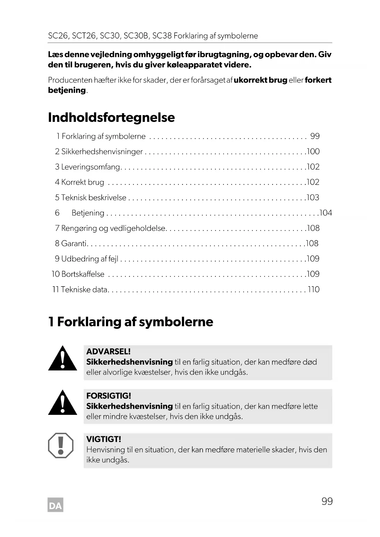 ADVARSEL! Sikkerhedshenvisning til en farlig situation, der kan medføre død eller alvorlige kvæstelser, hvis den ikke undgås. FORSIGTIG! Sikkerhedshenvisning til en farlig situation, der kan medføre lette eller mindre kvæstelser, hvis den ikke undgås. VIGTIGT! Henvisning til en situation, der kan medføre materielle skader, hvis den ikke undgås. SC26-SCT26-SC30-SC38_OPM_EMEA16.book Seite 99 Mittwoch, 19. Juni 2019 8:51 20DA Sikkerhedshenvisninger SC26, SCT26, SC30, SC30B, SC38