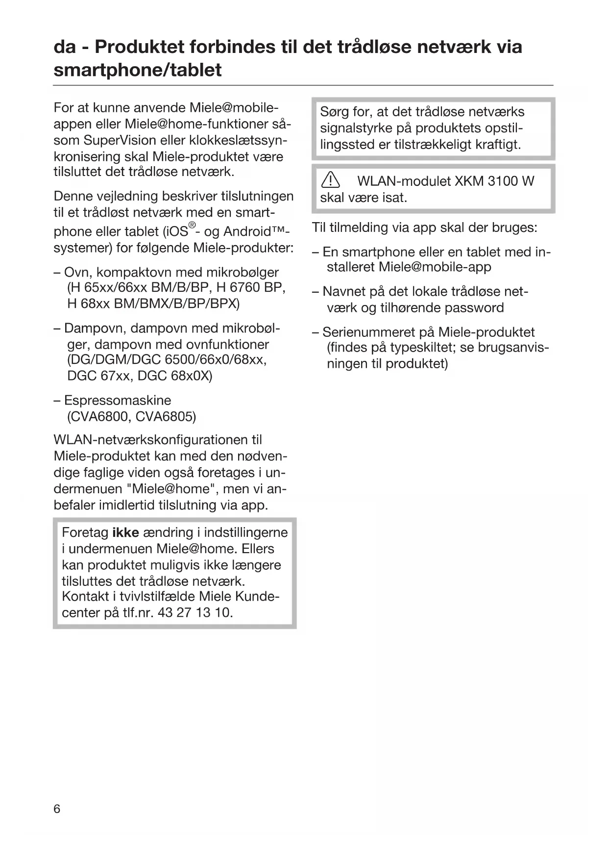 - og Android™- systemer) for følgende Miele-produkter: – Ovn, kompaktovn med mikrobølger (H65xx/66xxBM/B/BP, H6760BP, H68xxBM/BMX/B/BP/BPX) – Dampovn, dampovn med mikrobøl- ger, dampovn med ovnfunktioner (DG/DGM/DGC6500/66x0/68xx, DGC67xx, DGC68x0X) – Espressomaskine (CVA6800, CVA6805) WLAN-netværkskonfigurationen til Miele-produktet kan med den nødven- dige faglige viden også foretages i un- dermenuen "Miele@home", men vi an- befaler imidlertid tilslutning via app. Foretag ikke ændring i indstillingerne i undermenuen Miele@home. Ellers kan produktet muligvis ikke længere tilsluttes det trådløse netværk. Kontakt i tvivlstilfælde Miele Kunde- center på tlf.nr. 43 27 13 10. Sørg for, at det trådløse netværks signalstyrke på produktets opstil- lingssted er tilstrækkeligt kraftigt. WLAN-modulet XKM 3100 W skal være isat. Til tilmelding via app skal der bruges: – En smartphone eller en tablet med in- stalleret Miele@mobile-app – Navnet på det lokale trådløse net- værk og tilhørende password – Serienummeret på Miele-produktet (findes på typeskiltet; se brugsanvis- ningen til produktet)da - Produktet forbindes til det trådløse netværk via smartphone/tablet