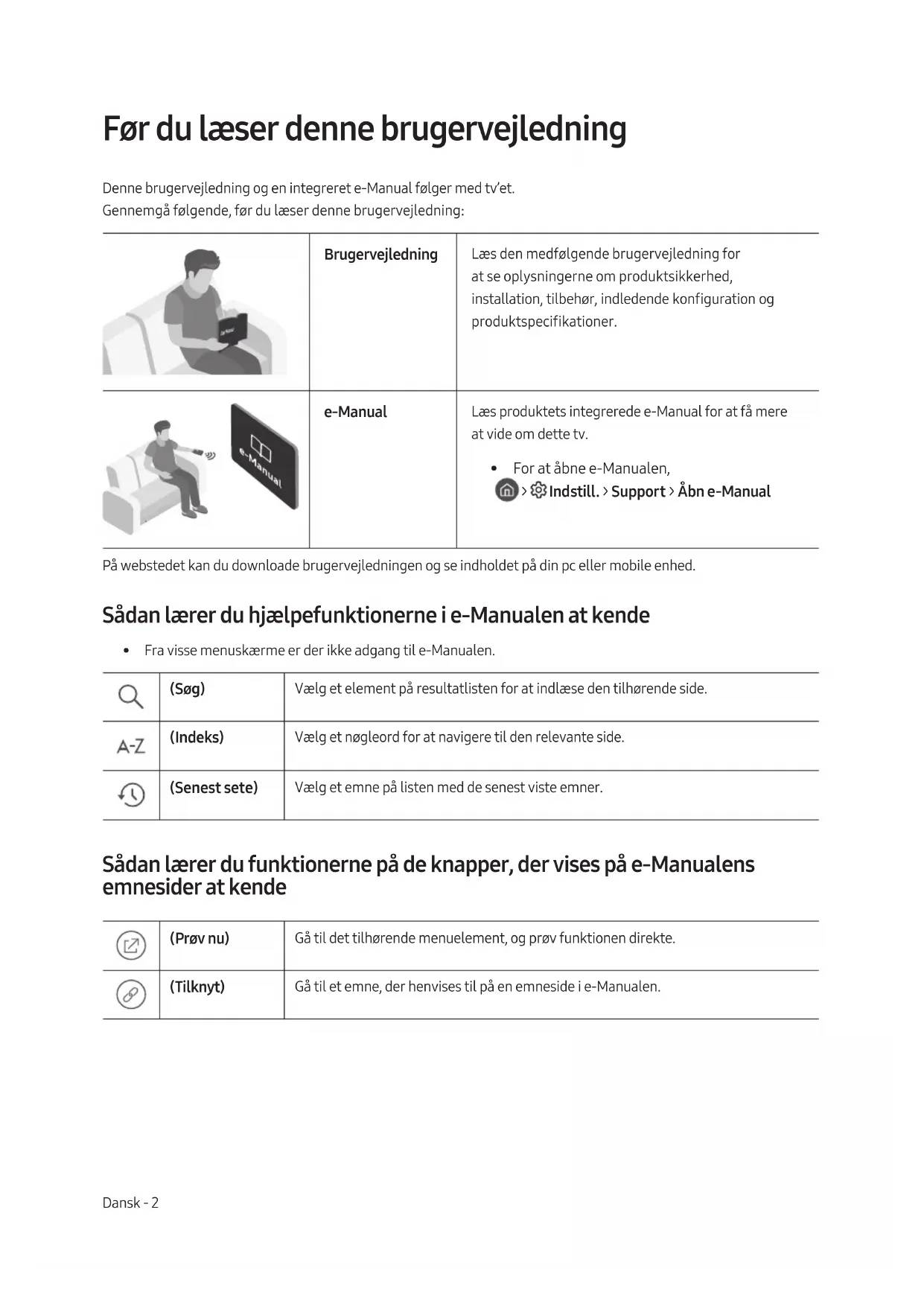 - For at åbne e-Manualen, > Indstill. > Support > Åbn e-Manual På webstedet kan du downloade brugervejledningen og se indholdet på din pc eller mobile enhed. Sådan lærer du hjælpefunktionerne i e-Manualen at kende