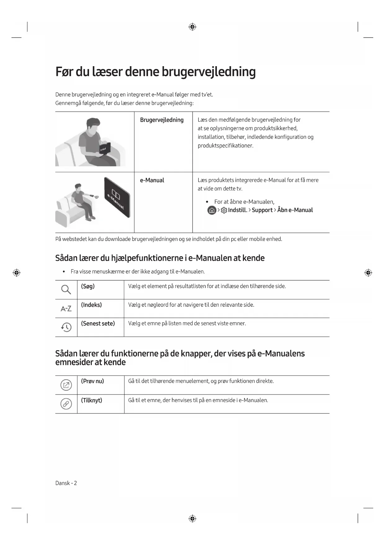 - Typisk strømforbrug målt i overensstemmelse med IEC 62087. Nedsættelse af strømforbruget Når du slukker for tv'et, går det i standbytilstand. I standbytilstand fortsætter det med en bruge en lille smule energi. For at mindske strømforbruget skal du fjerne strømkablet fra stikkontakten, når du ikke bruger tv'et i en længere periode. Licenser The terms HDMI and HDMI High-Denition Multimedia Interface, and the HDMI Logo are trademarks or registered trademarks of HDMI Licensing LLC in the United States and other countries. Anbefaling – kun EU Samsung Electronics erklærer herved, at dette tv overholder de grundlæggende krav og andre relevante bestemmelser i Direktiv 1999/5/EF. Den ofcielle overensstemmelseserklæring kan ndes på http://www.samsung.com. Gå til Support > Search Product Support, og indtast modelnavnet. Dette udstyr må kun anvendes indendørs. Dette udstyr kan anvendes i alle EU-lande. Dansk - 20 Dansk - 21Korrekt bortskaffelse af dette produkt (elektrisk & elektronisk udstyr) (Gældende i lande med separate indsamlingssystemer) Mærket på dette produkt, på tilbehør eller i den medfølgende dokumentation betyder, at produktet og elektronisk tilbehør hertil (f.eks. oplader, hovedsæt, USB-ledning) ikke må bortskaffes sammen med almindeligt husholdningsaffald efter endt levetid. For at undgå skadelige miljø- eller sundhedspåvirkninger på grund af ukontrolleret affaldsbortskaffelse skal ovennævnte bortskaffes særskilt fra andet affald og indleveres behørigt til fremme for bæredygtig materialegenvinding. Forbrugere bedes kontakte forhandleren, hvor de har købt produktet, eller kommunen for oplysning om, hvor og hvordan de kan indlevere ovennævnte med henblik på miljøforsvarlig genvinding. Virksomheder bedes kontakte leverandøren og læse betingelserne og vilkårene i købekontrakten. Dette produkt og elektronisk tilbehør hertil bør ikke bortskaffes sammen med andet erhvervsaffald. Korrekt bortskaffelse af batterierne i dette produkt (Gældende i lande med separate indsamlingssystemer) Mærket på batterier, dokumentationen eller emballagen betyder, at batterierne i dette produkt efter endt levetid ikke må bortskaffes sammen med andet husholdningsaffald. Mærkning med de kemiske symboler Hg, Cd eller Pb betyder, at batteriet indeholder kviksølv, cadmium eller bly over grænseværdierne i EU-direktiv 2006/66. Hvis batterierne ikke bortskaffes korrekt, kan disse stoffer være skadelige for menneskers helbred eller for miljøet. For at beskytte naturens ressourcer og fremme genbrug, skal batterier holdes adskilt fra andre typer affald og genanvendes via dit lokale, gratis batteriretursystem. Der ndes oplysninger om Samsungs miljømæssige forpligtelser samt produktspecikke lovmæssige ansvarsområder, f.eks. vedr. REACH, WEEE og batterier, på http://www.samsung.com/uk/aboutsamsung/ samsungelectronics/corporatecitizenship/data_corner.html ADVARSEL - FOR AT FORHINDRE, AT DER OPSTÅR BRAND, SKAL STEARINLYS OG ANDRE GENSTANDE MED ÅBEN ILD ALTID HOLDES PÅ AFSTAND AF DETTE APPARAT. Dansk - 20 Dansk - 21 DanskNorsk - 2 Norsk - 3 Før du leser denne brukerhåndboken Denne TV-en kommer med denne brukerhåndboken og en innebygd e-Manual. Før du leser denne håndboken må du gjennomgå følgende: Brukerhåndbok Les denne medfølgende brukerhåndboken for informasjon om produktsikkerhet, installasjon, tilleggsutstyr, første kongurasjon og produktspesikasjoner. e-Manual For mer informasjon om denne TV-en kan du lese e-Manualen som er innebygd i produktet.