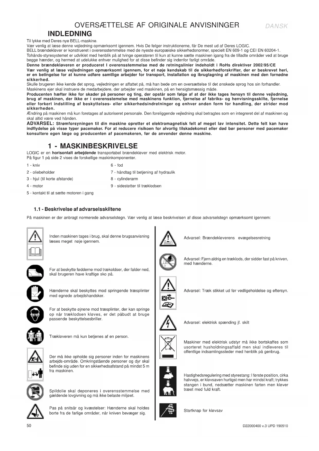 ADVARSEL: Brændekloveren BELL model LOGIC er udelukkende beregnet til at spalte brændeklodser, his mal svarer til de anbefalede angivelser (fig 2, side 2).
