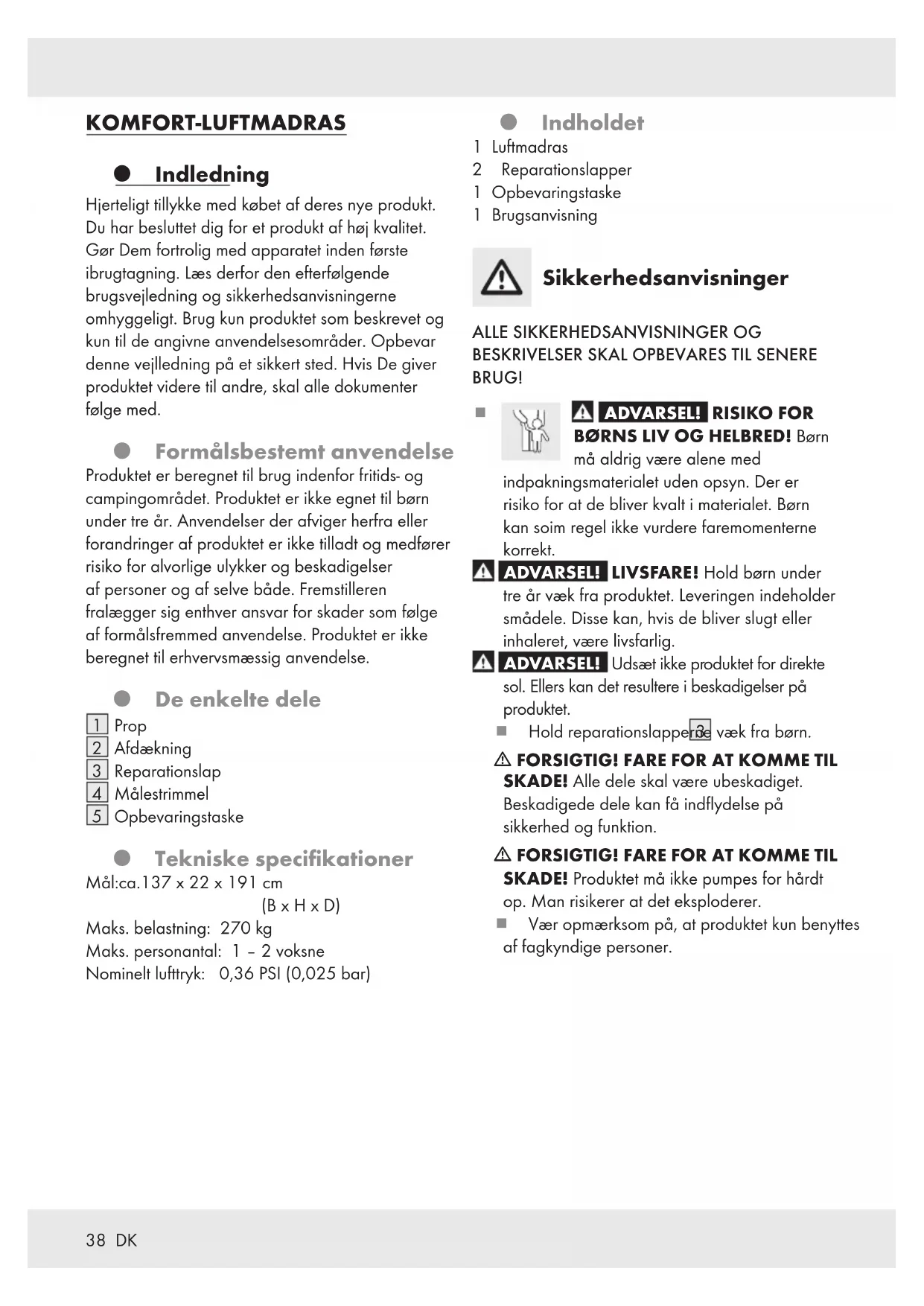 Produktet er beregnet til brug indenfor fritids- og campingområdet. Produktet er ikke egnet til børn under treår. Anvendelse der afviger herfra eller forandringer af produktet er ikke tilladt og medfører risiko for alvorlige ulykker og beskadigelser af personer og af delve både. Fremstilleren fraægger sig enthver ansvar for skader som følge af formålsfremmed anvendelse. Produktet er ikke beregnet til erhverbemssig anvendelse.