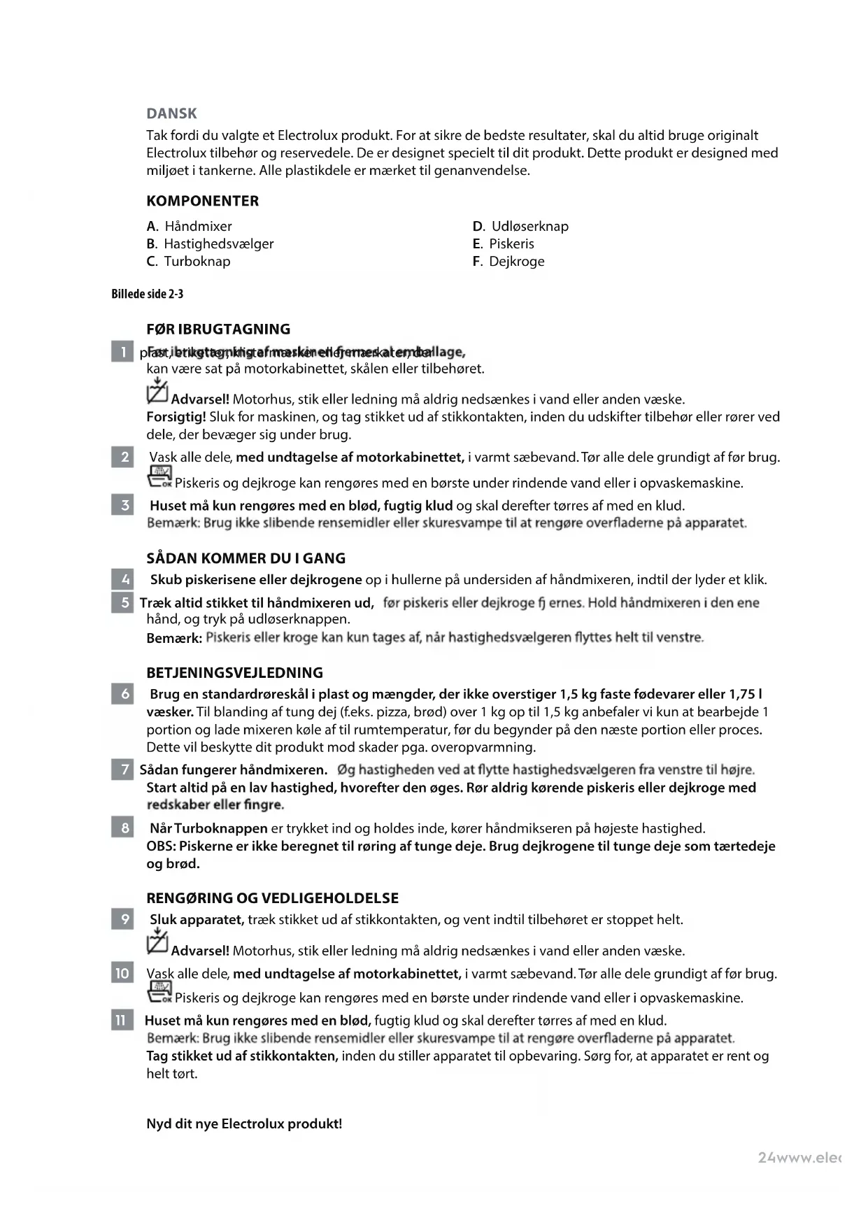 9 Sluk apparatet, træk stikket ud af stikkontakten, og vent indtil tilbehøret er stoppet helt. Advarsel! Motorhus, stik eller ledning må aldrig nedsænkes i vand eller anden væske. 10 Vask alle dele, med undtagelse af motorkabinettet, i varmt sæbevand. Tør alle dele grundigt af før brug. Piskeris og dejkroge kan rengøres med en børste under rindende vand eller i opvaskemaskine. 11 Huset må kun rengøres med en blød, fugtig klud og skal derefter tørres af med en klud. Tag stikket ud af stikkontakten, inden du stiller apparatet til opbevaring. Sørg for, at apparatet er rent og helt tørt. Nyd dit nye Electrolux produkt!25www.electrolux.com