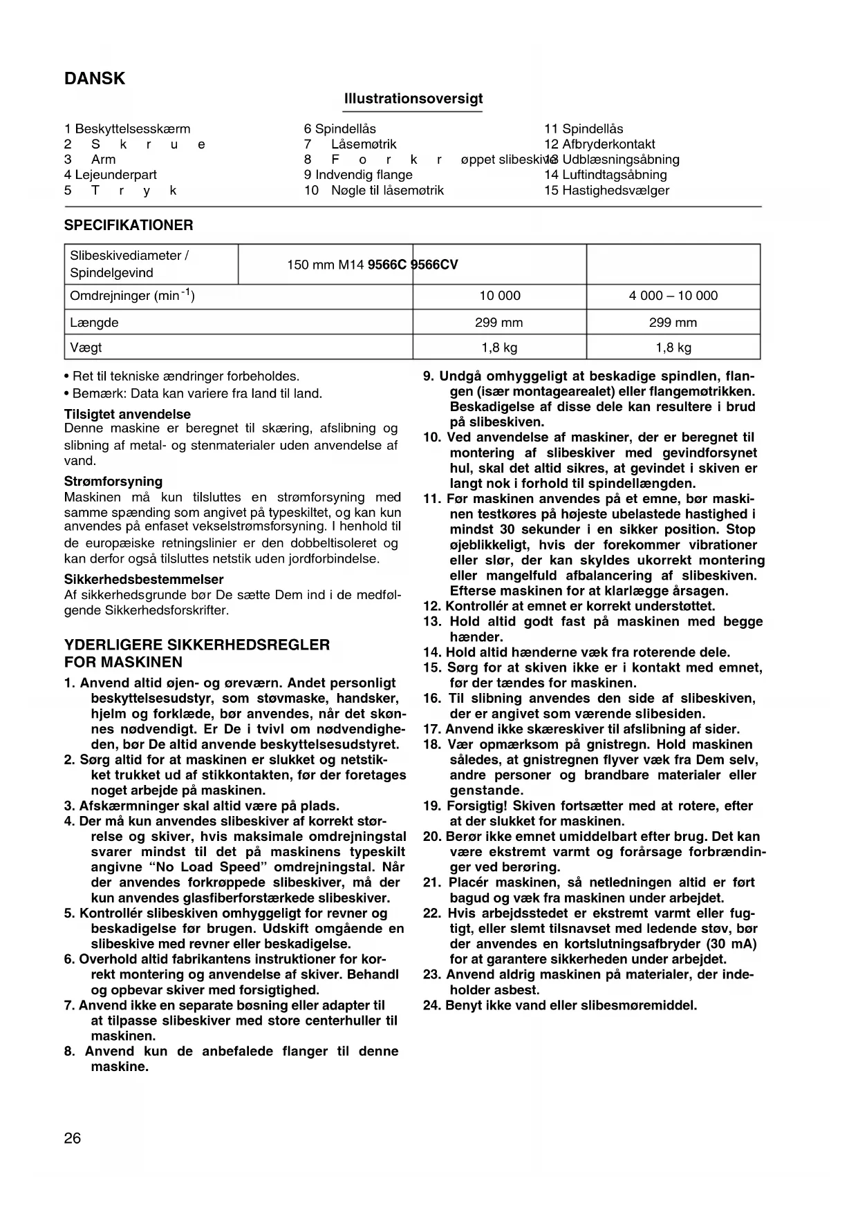 siden. GEM DISSE FORSKRIFTER. ANVENDELSE Montering af beskyttelsskærm (Fig. 1 og 2) Vigtig: Kontrollér altid, at maskinen er slået fra og at netstikket er taget ud, før De monterer eller afmonterer beskyttel- sesskærmen. Tr æk armen i pilens retning efter at have løsnet skruen. Montér beskyttelsesskærmen på lejeunderparten ved at rette den konvekse del af beskyttelsesskærmen ind efter den konkave del af lejeunderparten. Drej beskyttelses- skærmen 180 grader. Fastgør den med skruen efter at have trukket armen i pilens retning. Beskyttelsesskær- mens fastgørelsesvinkel kan justeres med armen, så vinklen passer til arbejdets art. Afmontering af beskyttelsesskærm. Følg monteringsproceduren i omvendt rækkefølge for at afmontere beskyttelsesskærmen. Montering af sidegrebet (hjælpegreb) (Fig. 3) Vigtigt: Kontrollér altid, at maskinen er slået fra og at netstikket er taget ud, før De monterer eller afmonterer sidegrebet. Sidegrebet bør altid fastgøres på maskinen før arbejdet påbegyndes. Sidegrebet kan installeres på begge sider af maskinen, alt efter hvilken position, der er bedst egnet og holder beskyttelsesskærmen i den rigtige stilling. Hold altid maskinen med en hånd på afbrydergrebet og den anden på sidegrebet under arbejdet. Spindlelås (Fig. 4) Tryk på spindlelåsen for at forhindre at spindlen drejer med, når der monteres eller afmonteres tilbehør. FORSIGTIG: Aktiver aldrig spindlelåsen, mens spindlen er i bevæ- gelse. Maskinen kan blive beskadiget. Montering og afmontering af slibeskiven (Fig. 5 og 6) Vigtigt: Kontrollér altid, at maskinen er slået fra, og netledningen taget ud af stikkontakten, før De monterer eller afmonte- rer slibeskiven. Montér den indvendige flange på spindlen. Anbring slibe- skiven over den indvendige flange, og skru flangemøtrik- ken på spindlen. Ved fastgøring af flangemøtrikken trykkes hårdt på spin- delstopknappen, således at spindlen ikke kan dreje. Skru derefter flangemøtrikken fast med nøglen ved at dreje i retning med uret. Ved afmontering af slibeskiven gen- nemføres ovennævnte fremgangsmåde i omvendt ræk- kefølge. Afbryderkontaktbetjening (Fig. 7) FORSIGTIG: Før netstikket sættes i stikkontakten, bør det altid kontrol- leres, at afbryderkontakten fungerer korrekt og returnerer til "O (OFF)" positionen, når den bageste del af afbryder- kontakten trykkes ned. Start maskinen ved at skyde afbryderkontakten mod ”I (ON)” positionen. Ved vedvarende arbejde trykkes den forreste del af afbryderkontakten ned for at låse den. Stop maskinen ved at trykke ned på den bagerste del af afbryderkontakten og skyde den ”O (OFF)” positionen. Hastighedsvælger (for 9566CV) (Fig. 8) Rotationshastigheden kan ændres ved at dreje hastig- hedsvælgeren til en given talindstilling fra 1 til 5. Højere hastighed opnås, når vælgeren drejes i retning af