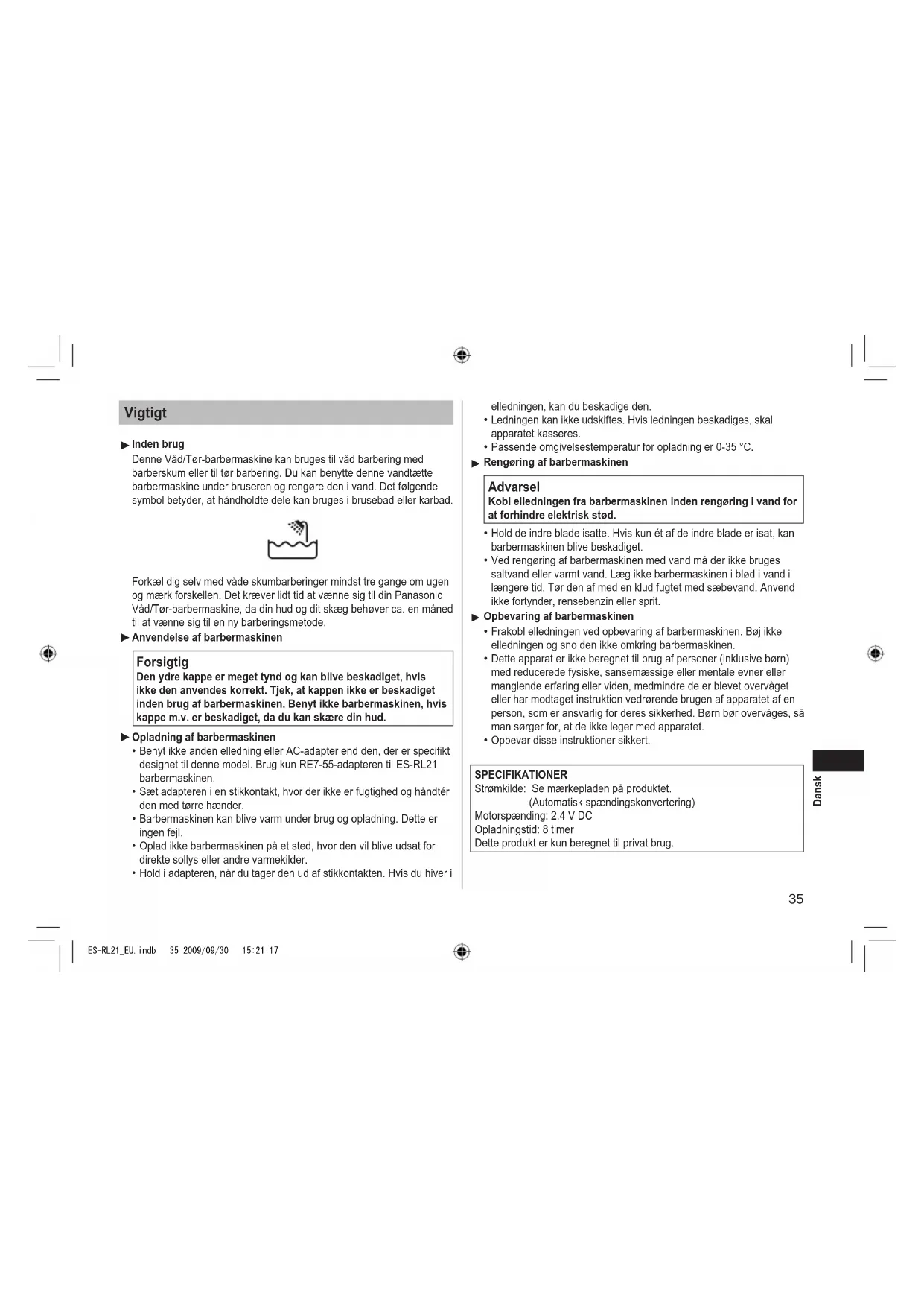 elledningen, kan du beskadige den. Ledningen kan ikke udskiftes. Hvis ledningen beskadiges, skal apparatet kasseres. Passende omgivelsestemperatur for opladning er 0‑35 °C. Rengøring af barbermaskinen Advarsel Kobl elledningen fra barbermaskinen inden rengøring i vand for at forhindre elektrisk stød. Hold de indre blade isatte. Hvis kun ét af de indre blade er isat, kan barbermaskinen blive beskadiget. Ved rengøring af barbermaskinen med vand må der ikke bruges saltvand eller varmt vand. Læg ikke barbermaskinen i blød i vand i længere tid. Tør den af med en klud fugtet med sæbevand. Anvend ikke fortynder, rensebenzin eller sprit. Opbevaring af barbermaskinen Frakobl elledningen ved opbevaring af barbermaskinen. Bøj ikke elledningen og sno den ikke omkring barbermaskinen. Dette apparat er ikke beregnet til brug af personer (inklusive børn) med reducerede fysiske, sansemæssige eller mentale evner eller manglende erfaring eller viden, medmindre de er blevet overvåget eller har modtaget instruktion vedrørende brugen af apparatet af en person, som er ansvarlig for deres sikkerhed. Børn bør overvåges, så man sørger for, at de ikke leger med apparatet. Opbevar disse instruktioner sikkert. SPECIFIKATIONER Strømkilde: Se mærkepladen på produktet. (Automatisk spændingskonvertering) Motorspænding: 2,4 V DC Opladningstid: 8 timer Dette produkt er kun beregnet til privat brug.