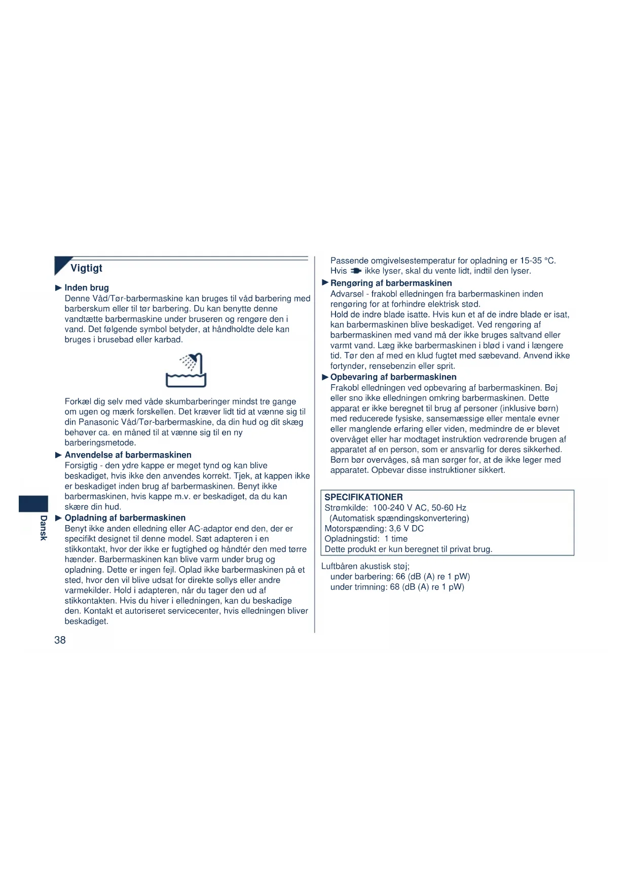 contacto con su distribuidor o proveedor para que le informe detalladamente. Información sobre la eliminación en otros países no pertenecientes a la Unión Europea Este símbolo sólo es válido en la Unión Europea. Si desea desechar este producto, póngase en contacto con las autoridades locales o con su distribuidor para que le informen sobre el método correcto de eliminación.38 Dansk Vigtigt Inden brug Denne Våd/Tør-barbermaskine kan bruges til våd barbering med barberskum eller til tør barbering. Du kan benytte denne vandtætte barbermaskine under bruseren og rengøre den i vand. Det følgende symbol betyder, at håndholdte dele kan bruges i brusebad eller karbad. Forkæl dig selv med våde skumbarberinger mindst tre gange om ugen og mærk forskellen. Det kræver lidt tid at vænne sig til din Panasonic Våd/Tør-barbermaskine, da din hud og dit skæg behøver ca. en måned til at vænne sig til en ny barberingsmetode. Anvendelse af barbermaskinen Forsigtig - den ydre kappe er meget tynd og kan blive beskadiget, hvis ikke den anvendes korrekt. Tjek, at kappen ikke er beskadiget inden brug af barbermaskinen. Benyt ikke barbermaskinen, hvis kappe m.v. er beskadiget, da du kan skære din hud. Opladning af barbermaskinen Benyt ikke anden elledning eller AC-adaptor end den, der er specifikt designet til denne model. Sæt adapteren i en stikkontakt, hvor der ikke er fugtighed og håndtér den med tørre hænder. Barbermaskinen kan blive varm under brug og opladning. Dette er ingen fejl. Oplad ikke barbermaskinen på et sted, hvor den vil blive udsat for direkte sollys eller andre varmekilder. Hold i adapteren, når du tager den ud af stikkontakten. Hvis du hiver i elledningen, kan du beskadige den. Kontakt et autoriseret servicecenter, hvis elledningen bliver beskadiget.