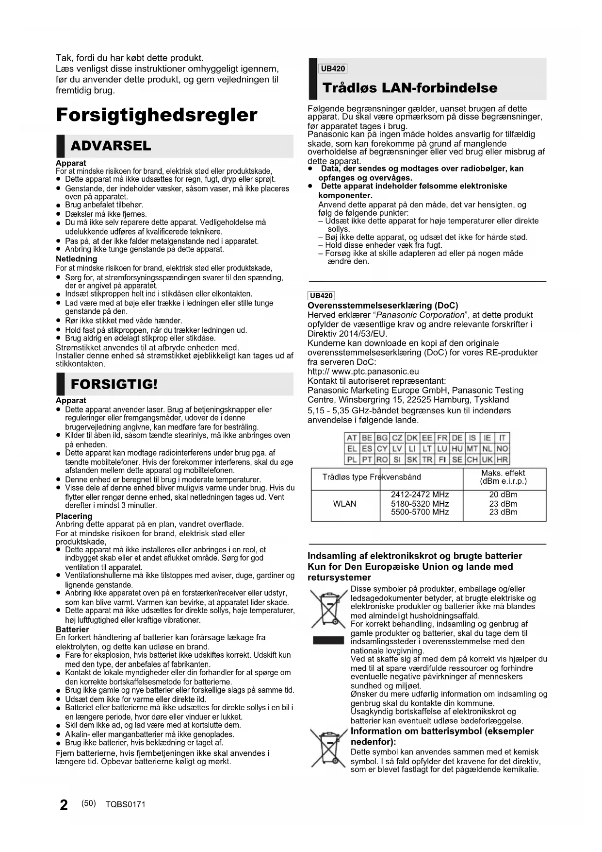 TQBS0171 Licenser Dette produkt anvender Cinavia-teknologi for at begrænse brugen af uautoriserede kopier af visse kommercielt fremstillede film og videoer og deres soundtracks. Se betjeningsvejledningen (PDF-format) for yderligere oplysninger. “AVCHD”, “AVCHD 3D”, “AVCHD Progressive” og “AVCHD 3D/ Progressive” er varemærker tilhørende Panasonic Corporation og Sony Corporation. Java er et registreret varemærke tilhørende Oracle og/eller dets associerede selskaber. Dolby, Dolby Audio og det dobbelte D-symbol er varemærker tilhørende Dolby Laboratories. Se http://patents.dts.com for DTS-patenter. Fremstillet under licens fra DTS, Inc. DTS, symbolet, DTS og symbolet sammen med DTS-HD og DTS-HD-logoet er registrerede varemærker og/eller varemærker tilhørende DTS, Inc. i USA og/eller andre lande. © DTS, Inc. Alle rettigheder forbeholdes. The product with Hi-Res AUDIO logo is conformed to High-Resolution Audio standard defined by Japan Audio Society. This logo is used under license from Japan Audio Society. Ordene HDMI og HDMI High-Definition Multimedia Interface og HDMI-logoet er varemærker eller registrerede varemærker tilhørende HDMI Licensing Administrator, Inc. i USA og andre lande. <AVC> Dette produkt gives i licens under AVC-patentporteføljelicensen til en forbrugers private brug eller til andre anvendelser, som der ikke modtages vederlag for, til at (i) kode videoer i overensstemmelse med AVC-standard (“AVC Video”) og/eller (ii) afkode AVC Video, der er blevet kodet af en forbruger til privat brug og/eller fra en videoudbyder, som har licens til levering af AVC Video. Der gives ingen andre licenser, og ingen andre anvendelser accepteres. Yderligere oplysninger kan fås ved henvendelse til MPEG LA, L.L.C. Se http://www.mpegla.com <VC-1> Dette produkt gives i licens under VC-1 patentporteføljelicens til privat og ikke-kommerciel brug til forbrugere for at (i) kode videoen i overensstemmelse med VC-1 standard (“VC-1 video”) og/eller (ii) for at afkode VC-1 video, som er blevet kodet af en forbruger til privat og ikke-kommerciel brug og/eller fra en videoudbyder, som har licens til levering af VC-1 video. Der gives ingen andre licenser, og ingen andre anvendelser accepteres. Yderligere oplysninger kan fås ved henvendelse til MPEG LA, L.L.C. Se http://www.mpegla.com “DVD Logo” er et varemærke for DVD Format/Logo Licensing Corporation. “Wi-Fi