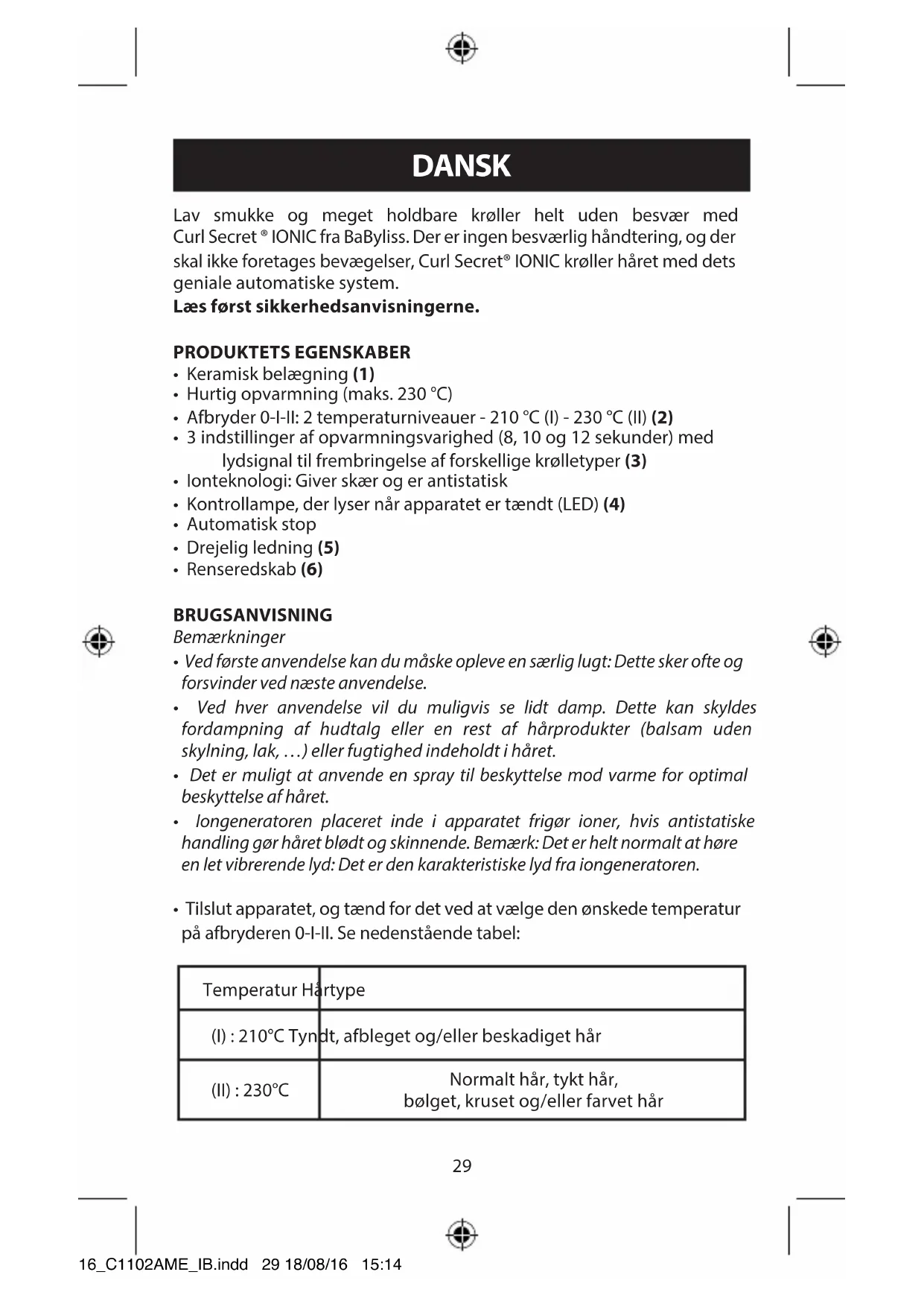 - Tilslut apparatet, og tænd for det ved at vælge den ønskede temperatur på afbryderen 0-I-II. Se nedenstående tabel: Temperatur Hårtype (I) : 210°C Tyndt, afbleget og/eller beskadiget hår (II) : 230°C Normalt hår, tykt hår, bølget, kruset og/eller farvet hår 16_C1102AME_IB.indd 29 18/08/16 15:1430