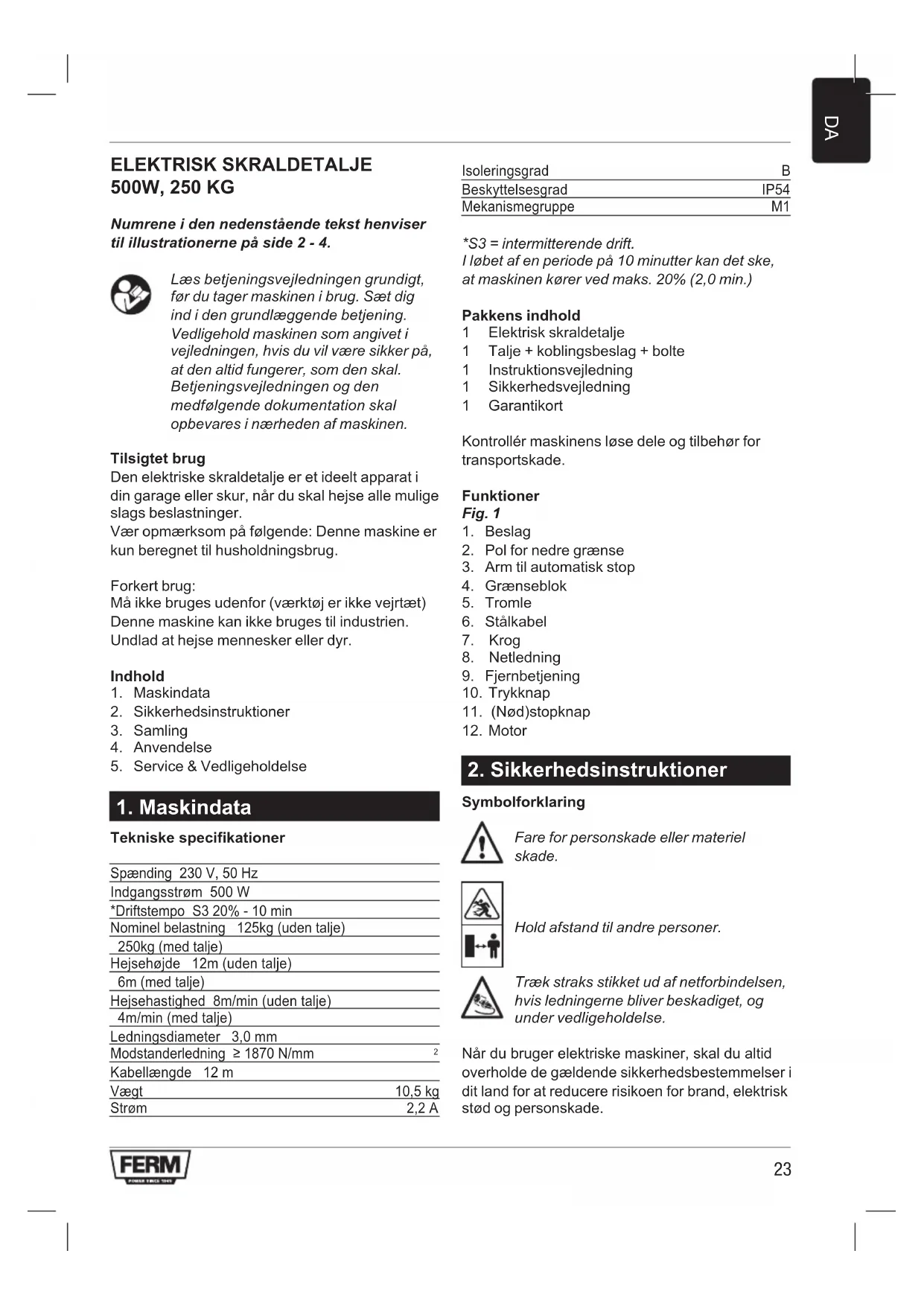 Vigtigt! Hejseapparatets elektriske motor leveres ikke med en mekanisk overbelastningsafbryder (for at undgå uventet og uønsket genstart). Hvis du ikke kan hijse en last, skal du derfor ikke insistere, men lade motoren køle ned.
