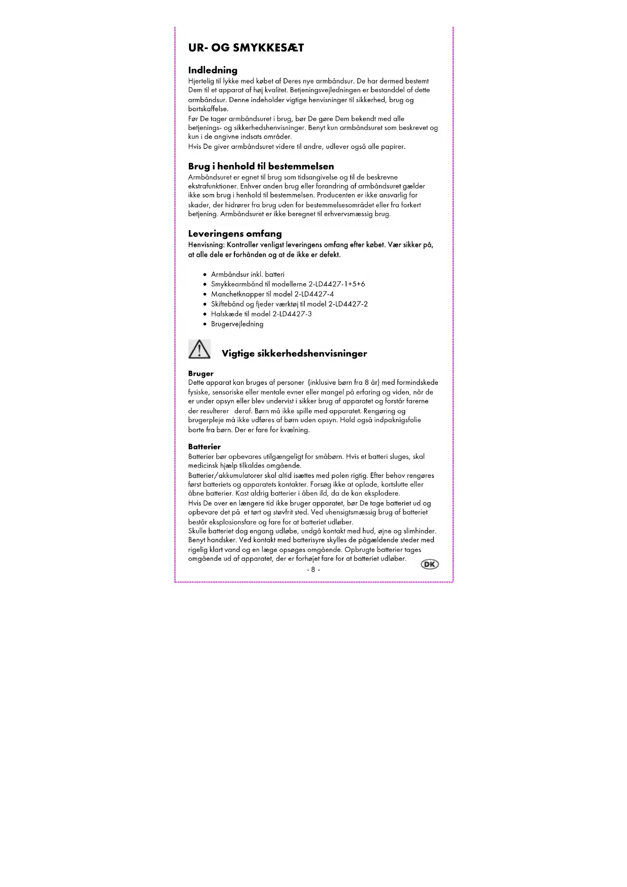 Vigtige sikkerhedshenvisninger Bruger Dette apparat kan bruges af personer (inklusive børn fra 8 år) med formindskede fysiske, sensoriske eller mentale evner eller mangel på erfaring og viden, når de er under opsyn eller blev undervist i sikker brug af apparatet og forstår farerne der resulterer deraf. Børn må ikke spille med apparatet. Rengøring og brugerpleje må ikke udføres af børn uden opsyn. Hold også indpaknigsfolie borte fra børn. Der er fare for kvælning. Batterier Batterier bør opbevares utilgængeligt for småbørn. Hvis et batteri sluges, skal medicinsk hjælp tilkaldes omgående. Batterier/akkumulatorer skal altid isættes med polen rigtig. Efter behov rengøres først batteriets og apparatets kontakter. Forsøg ikke at oplade, kortslutte eller åbne batterier. Kast aldrig batterier i åben ild, da de kan eksplodere. Hvis De over en længere tid ikke bruger apparatet, bør De tage batteriet ud og opbevare det på et tørt og støvfrit sted. Ved uhensigtsmæssig brug af batteriet består eksplosionsfare og fare for at batteriet udløber. Skulle batteriet dog engang udløbe, undgå kontakt med hud, øjne og slimhinder. Benyt handsker. Ved kontakt med batterisyre skylles de pågældende steder med rigelig klart vand og en læge opsøges omgående. Opbrugte batterier tages omgående ud af apparatet, der er forhøjet fare for at batteriet udløber.-