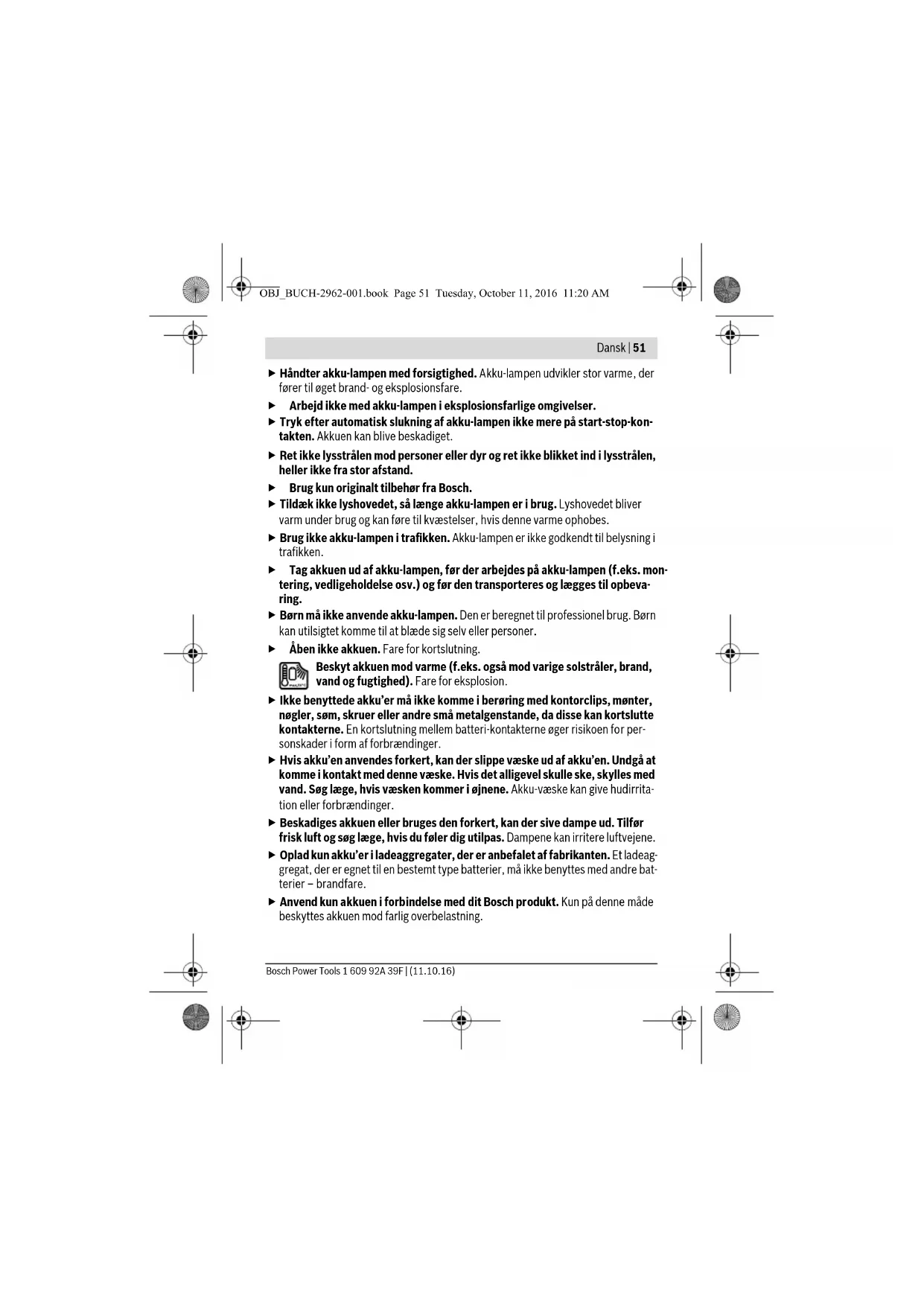 0...+45 –20...+50 Farvegengivelsen af de belyste genstande kan være forvrænget.* afhængigt af den anvendte akku** begrænset effekt ved temperaturer <0 °C OBJ_BUCH-2962-001.book Page 52 Tuesday, October 11, 2016 11:20 AMDansk | 53 Bosch Power Tools 1 609 92A 39F | (11.10.16) Montering Opladning af akku (tilbehør) Bemærk: Akkuen er til dels oplades ved udleveringen. For at sikre at akkuen fungerer 100 % oplades akkuen helt før første ibrugtagning. Li-ion-akkuen kan oplades til enhver tid, uden at levetiden forkortes. En afbrydelse af opladningen beskadiger ikke akkuen. Li-ion-akkuen er beskyttet mod afladning med „Electronic Cell Protection (ECP)“. Er akkuen afladet, slukkes akku-lampen med en beskyttelseskontakt. Tryk efter automatisk slukning af akku-lampen ikke mere på start-stop-kon- takten. Akkuen kan blive beskadiget. For at tage batteriet ud 5 skal du trykke på udløsertasten 4 og trække batteriet ud af den batteridrevne lampe. Undgå brug af vold. Læs og overhold henvisningerne mhr. bortskaffelse. Brug Ibrugtagning Isæt akku Anbring den opladte akku 5 i akku-holderen, til denne falder mærkbart i hak og flugter med kanten. Tænd/sluk Tryk til ibrugtagning af akku-lampen på start-stop-kontakten 2. Akku-lampen slukkes ved at trykke på start-stop-kontakten 2 en gang til. For at spare på energien bør du kun tænde for akku-lampen, når du bruger den. Anbefalede batterier GBA 10,8V.. GBA 12V... Anbefalede ladere AL 11.. CV GAL 12.. CV Akku-lampe GLI 12V-300 Farvegengivelsen af de belyste genstande kan være forvrænget.